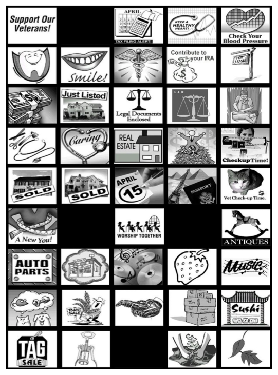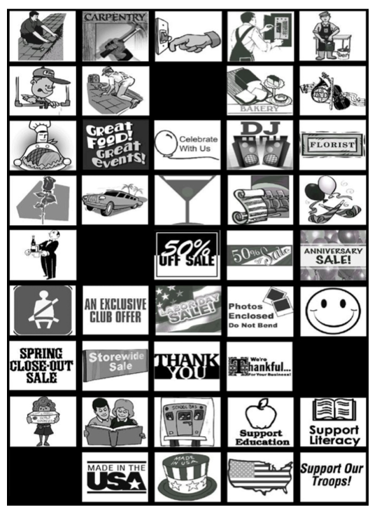 Page 1 Row 6: buckle up, exclusive offer, Labor Day sale, photos enclosed, smiley face