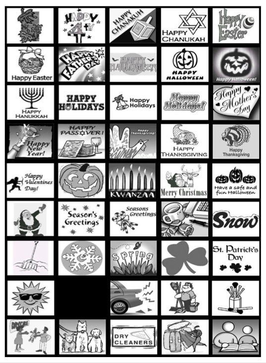 Page 3 Row 3: Happy Hanukkah, Happy Holidays (3x), Happy Mother's Day