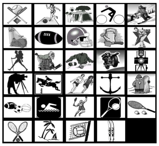 Page 5 Row 2: exercise, football (2x), gardening, golf