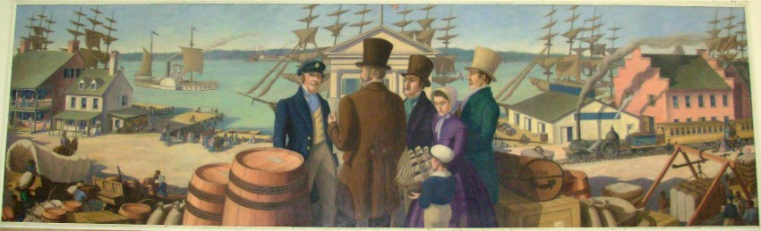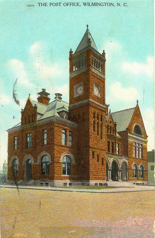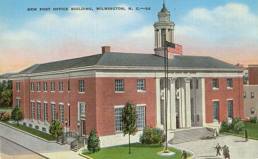 History: On July 26, 1775 the Second Continental Congress meeting in Philadelphia established an American Post Office with Ben Franklin as Postmaster General. It provided a line of posts from Falmouth in New England to Savannah, Georgia. Several years later on October 5, 1789 the first postmaster, John Bradley was assigned to Wilmington to operate the post office as a colonial office. Early Wilmington post offices were located in stores and hotels and the Postmasters were paid by a percentage of the mail they processed. The first post office in Wilmington was located in the old Custom House which was completed in 1846. It remained in that Federal Building until 1874 when a two-story brick building was erected on the southwest corner of Second and Chestnut Streets. In 1888 the construction of a main post office began on the site of the former home of RR Bridges at the corner of Front and Chestnut Streets. It was completed in 1891 and was made of brown granite from Wadesboro NC. It had two faces carved over the entrance, one happy and the other, dejected. Patrons rumored that one face had received a letter and the other received none. It was locally called the, "Brownstone Post Office." As Wilmington grew, it was necessary to construct a new downtown main post office. The cornerstone was laid on September 27, 1936 and the new post office was dedicated on May 29, 1937. Its lobby contains a mural painted in 1940 by William F Pfohl depicting the historic Wilmington waterfront. |