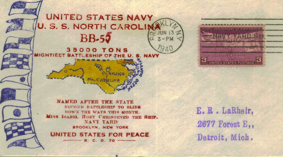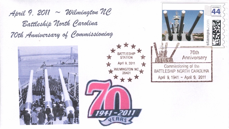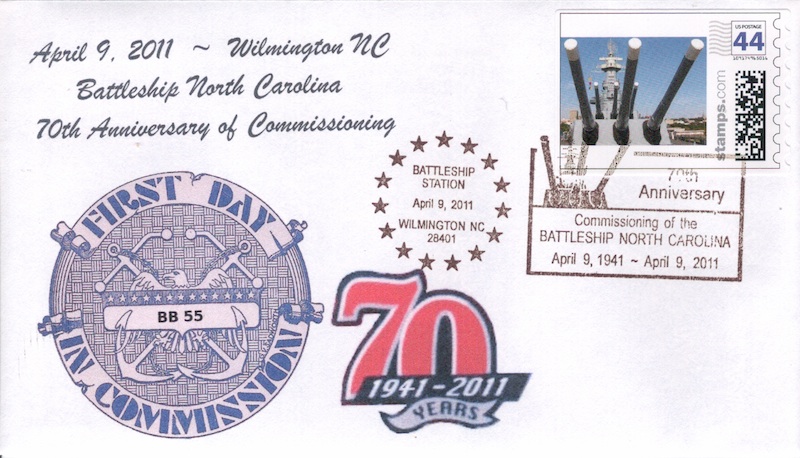 commemorating the 70th anniversary of the commissioning of the USS North Carolina. History: The USS North Carolina battleship (BB-55) was built in the Brooklyn Navy Yard in New York City. Her keel was laid in October 27, 1937 and she was launched into the East River on June 13, 1940. Armaments were added and she was fitted-out for her mission during late 1940 and early 1941. The USS North Carolina was commissioned on April 9, 1941. When Pearl Harbor was attacked by the Japanese on December 7, 1941, she was undergoing shakedown and training cruises in the Atlantic. She was directed to the Pacific in June 1942 and took part in the Solomons campaign. She covered the initial landings on Guadalcanal and participated in the Battle of the Eastern Solomons in August 1942 when she was damaged by a Japanese submarine torpedo. After being repaired at Pearl Harbor Navy Yard, she returned to the Solomons combat zone toward the end of 1942. In November 1943 she assisted in capturing enemy positions in the Gilbert Islands. This began a pattern of operations for her that lasted for the rest of WW-II. She served in the anti-aircraft screen of aircraft carrier task forces and used her heavy guns to bombard Japanese-held islands. During 1944 she was involved in the Marshalls operation in January-February, attacks on Central Pacific targets through the late winter and spring, the Marianas invasion and Battle of Philippine Sea in June, and Western Pacific carrier strikes in November and December. The USS North Carolina continued her Western Pacific activities in 1945 participating in the invasions of Iwo Jima in February and Okinawa in March and April. She also screened carriers on raids throughout the combat zone including attacks on the Japanese home islands. She was off-Japan in August and September during Japan's surrender. The USS North Carolina returned to the US in October 1945 and operated in the Atlantic until she was inactivated in 1946. She was decommissioned in June 1947 and became part of the "mothball" fleet until stricken from the Navy list in June 1960. On October 2, 1961 she arrived at her current berth in Wilmington NC. Later the next year, on April 25, 1962 the USS North Carolina was officially dedicated as North Carolina's museum and memorial to its WW-II veterans. Visit the USS North Carolina Battleship Memorial. |