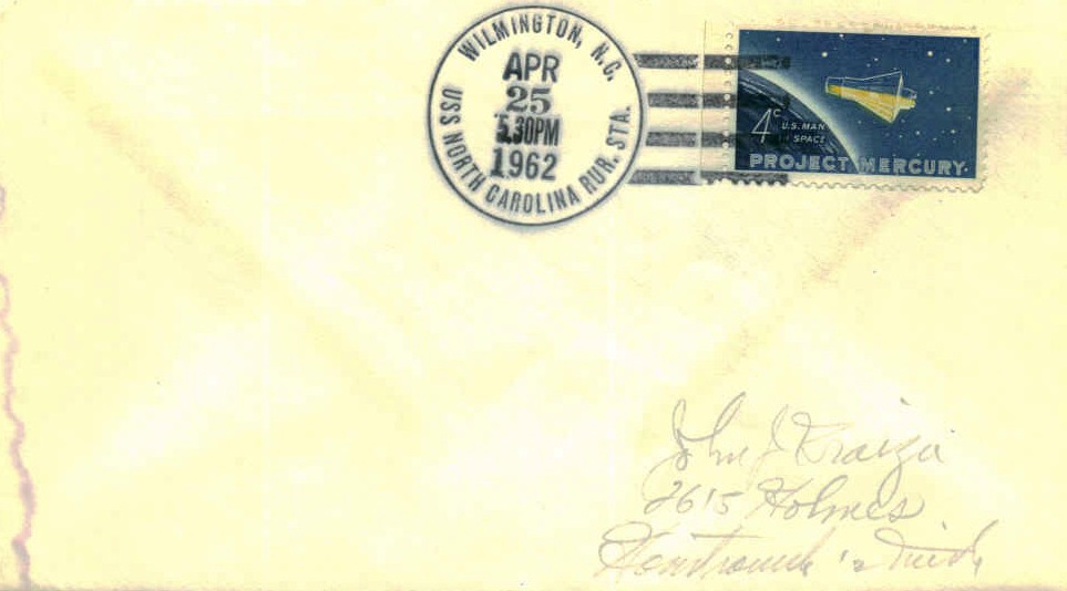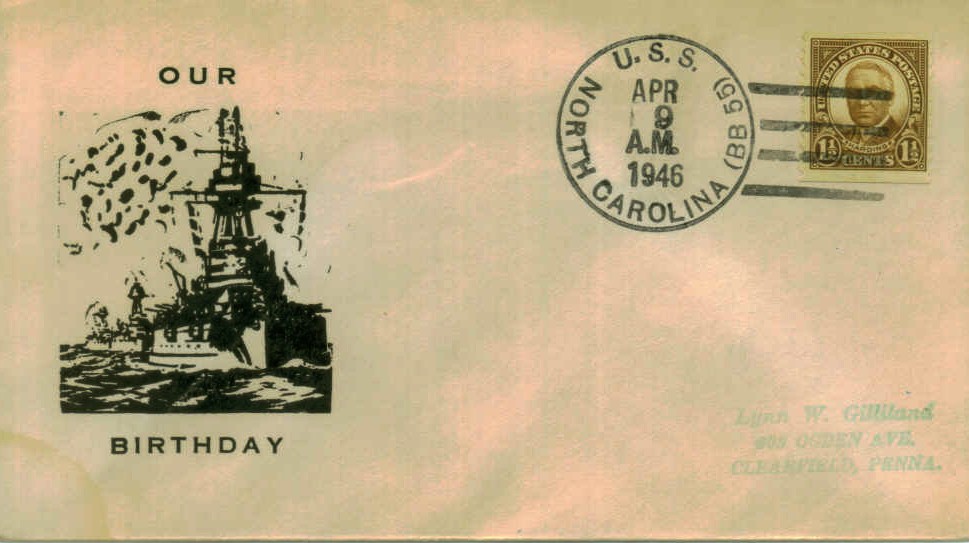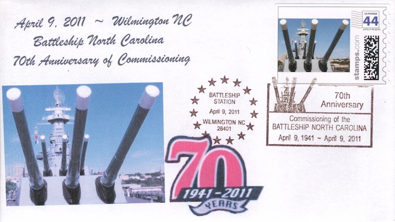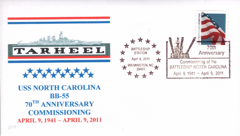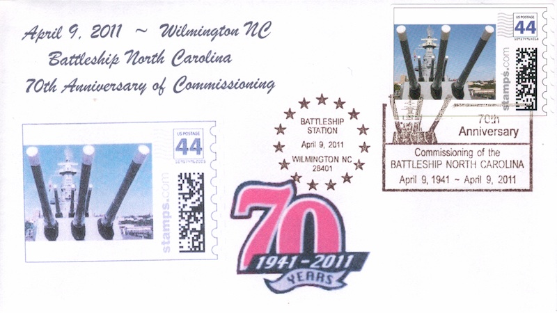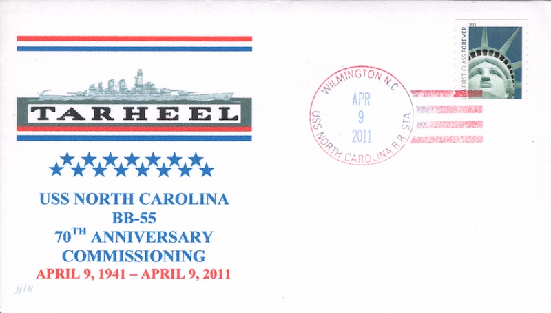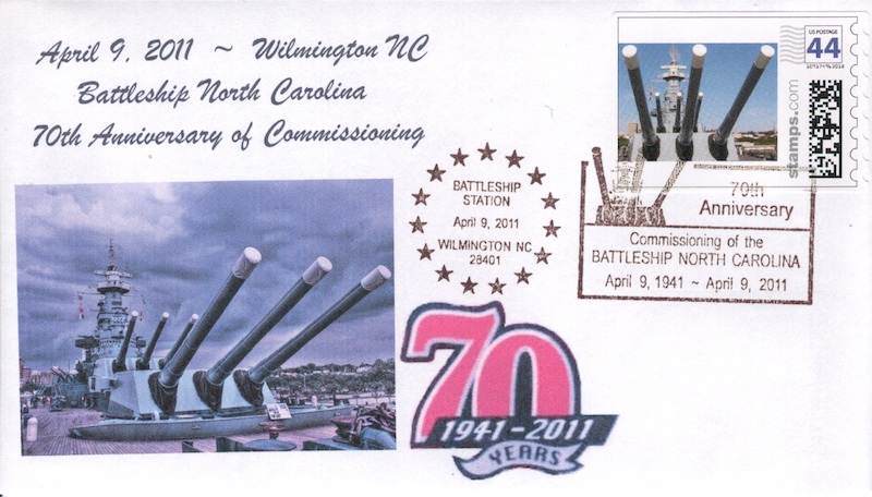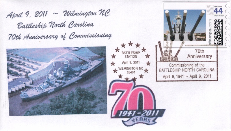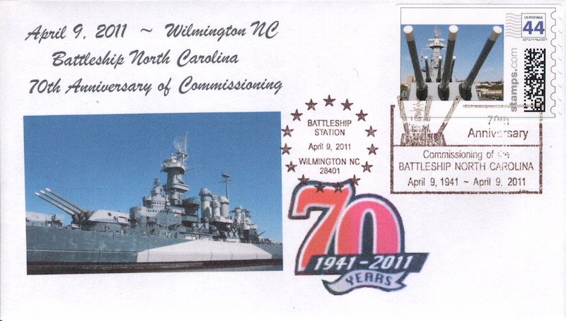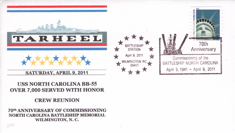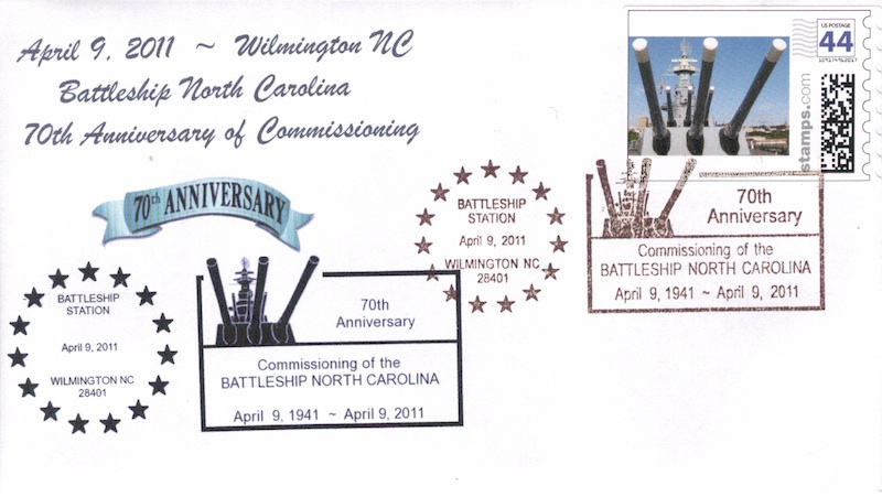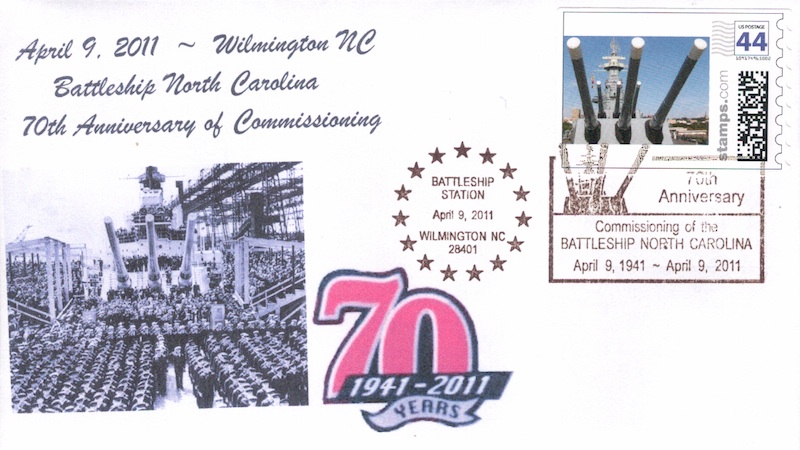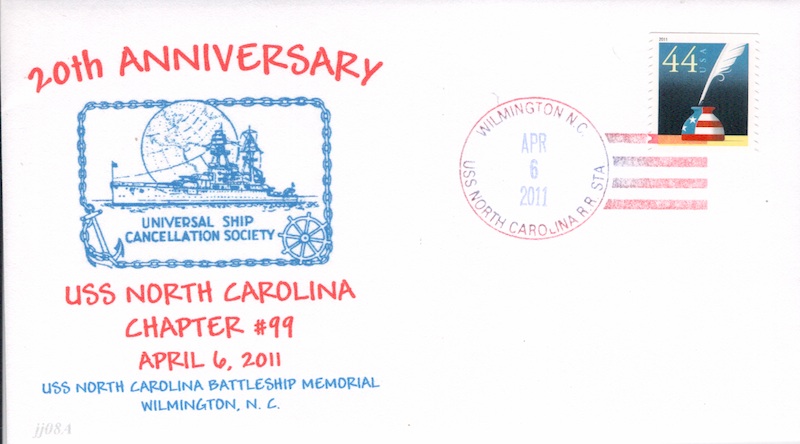 4496 | A cover cancelled on board the Battleship North Carolina on April 6, 2011 commemorating the 20th Anniversary of the USS North Carolina chapter #99 of the USCS. History: Founded in 1932, the Universal Ship Cancellation Society (USCS) is an international philatelic organization of over 1,100 members with an interest in postmarks and covers from all maritime services. This includes Navy ships of all countries, Marine Corps, Coast Guard, Navy bases, merchant ships with seapost and paquebot markings, related cachets, and other naval memorabilia. It is the only organization in the United States devoted to Navy and maritime covers, and is one of the oldest specialized postal history societies in the world. The USS North Carolina Chapter #99 of the USCS had its 20th Anniversary celebration on board the Battleship on April 6, 2011. |