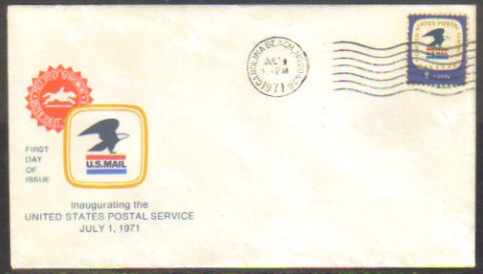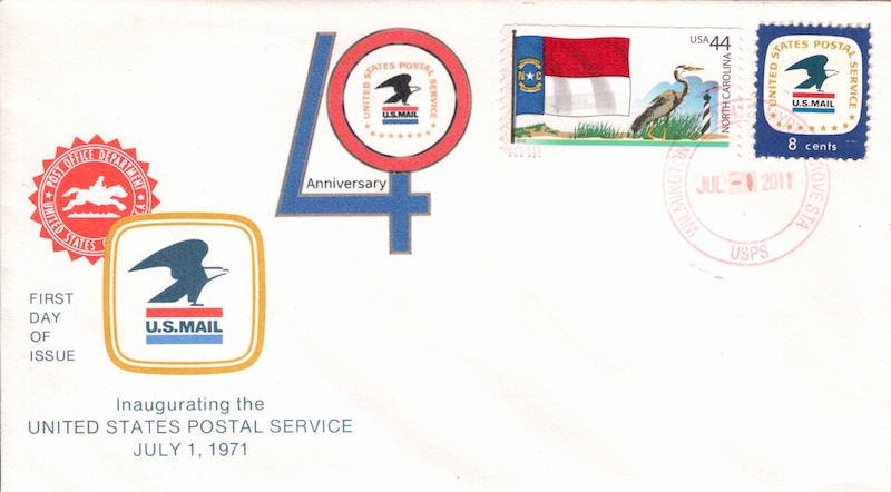 The top cover was cancelled in Carolina Beach NC on July 1, 1971 commemorating the inauguration of the USPS. The middle cover was cancelled in Jamaica NY on July 1, 1971 and was cancelled a second time in Wilmington NC on July 1, 2011 recognizing the 40th anniversary of the creation of the USPS. The bottom cover was cancelled in Wilmington NC on July 1, 2011. Of noteworthy interest is that these covers contain the USPS stamp issued in 1971 as well as the North Carolina Flags of Our Nation stamp issued in 2010. History: On July 26, 1775 the Second Continental Congress meeting in Philadelphia established an American Post Office with Ben Franklin as Postmaster General. It provided a line of posts from Falmouth in New England to Savannah, Georgia. In 1792 the Post Office was elevated to a cabinet-level Department remaining that way until the Postal Reorganization Act was approved by Congress on August 12, 1970. This Act created the US Postal Service (USPS) to become effective on July 1, 1971 as an independent agency of the US government responsible for providing postal service in the United States. It was directed to improve its performance through the development of efficient mail-handling systems and to operate its own planning and engineering programs. Additionally, it was responsible for protecting the mails from loss or theft and apprehending those who violate postal laws. The USPS is headed by the postmaster general who through its board of governors supervise approximately 38,000 post offices, branches, stations and community post offices throughout the US. On October 5, 1789 the first postmaster, John Bradley was assigned to Wilmington to operate the post office as a colonial office. Early Wilmington post offices were located in stores and hotels and the Postmasters were paid by a percentage of the mail they processed. The first post office in Wilmington was located in the old Custom House which was completed in 1846. It remained in that Federal Building until 1874 when a two-story brick building was erected on the southwest corner of Second and Chestnut Streets. In 1888 the construction of a main post office began on the site of the former home of RR Bridges at the corner of Front and Chestnut Streets. It was completed in 1891 and was made of brown granite from Wadesboro NC. It had two faces carved over the entrance, one happy and the other, dejected. Patrons rumored that one face had received a letter and the other received none. It was locally called the, "Brownstone Post Office." |