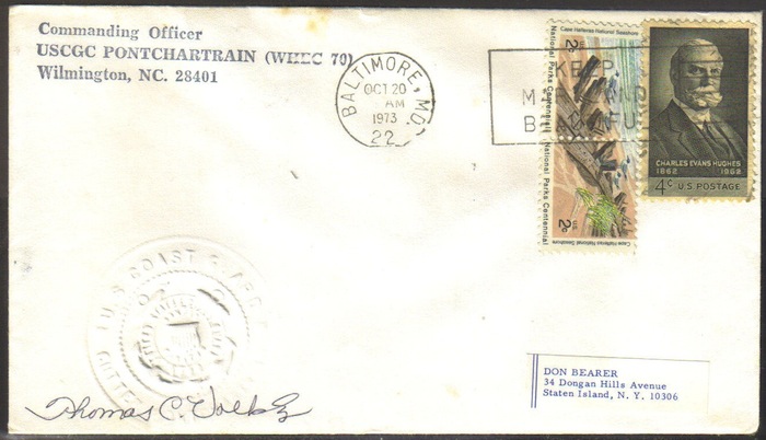 A cover canceled on October 20, 1973 at Baltimore MD. It commemorates the decommissioning of the Coast Guard cutter, USCGC Pontchartrain which was stationed in Wilmington NC. It was sent (and autographed) by the Pontchartrain's Commanding Officer, Thomas C Volk. History: USCGC Pontchartrain (WHEC-70) was an Owasco Class high endurance cutter built for WW-II service with the US Coast Guard. She was commissioned days before the end of the WW-II and did not see combat action until Viet Nam. She patrolled Viet Nam waters as a part of US Coast Squadron Three from April 2 to October 25, 1970. The Coast Guard played a significant role in securing Vietnam's 1,200-mile coastline. Some 8,000 Coast Guardsmen and 56 different combatant vessels were assigned to duty there. Coast Guardsmen destroyed enemy supply ships, supported ground units, rescued American and other friendly forces and carried out humanitarian roles. When the Pontchartrain returned to the US she spent her the last 18 months in Wilmington, NC before she was decommissioned on October 19, 1973. |