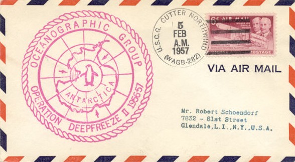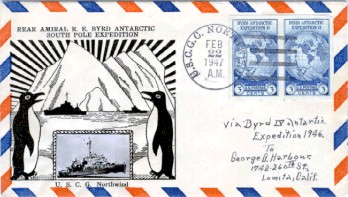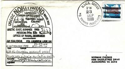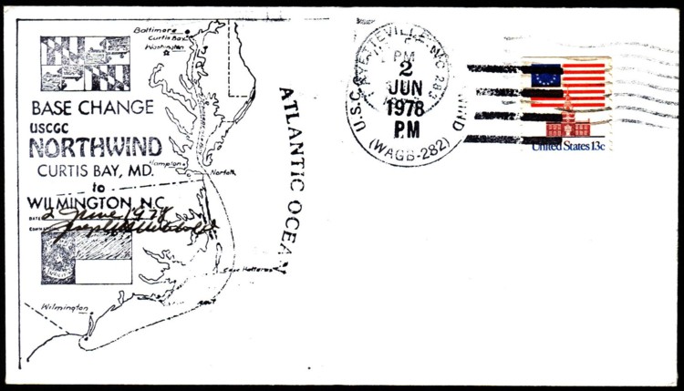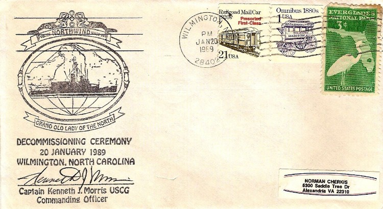 A cover canceled on January 20, 1989 at Wilmington NC commemorating the decommissioning of the US Coast Guard Cutter, USCGC Northwind (WAGB-282). The cover is autographed by its Commanding Officer, Captain Kenneth J Morris. History: The USCGC Northwind was launched on February 25, 1945 and commissioned July 28, 1945. It was a "Wind" Class icebreaker modeled after the Swedish icebreaker, Ymer. Amongst other icebreaking operations, the Northwind participated in Antarctic Operation High Jump (1946/47), Bering Sea scientific expeditions (1955), Distant Early Warning (DEW) Line operations (1955), Antarctic Operation Deep Freeze (1956/57), oceanographic experiments in the East Siberian Sea and Arctic Ocean (1962) and conducted oceanographic experiments in the Chukchi, East Siberian and Laptev seas (1963). It continued to serve on various arctic operations with duties including laying cables, oceanographic studies and re-supplying the DEW Line (into the mid-1980s). The Northwind was stationed in Seattle WA (1973), Baltimore MD (1973-1978) and from 1978 to 1989, stationed at Wilmington NC where it was deployed for icebreaking including operations in the Great Lakes. The last mission of the Northwind (Project CEAREX) in late 1988 was to penetrate the Arctic pack ice for the Norwegian research vessel, "RV POLARBJORN." It was the final cruise of the Northwind before returning to its home port of Wilmington NC. The USCGC Northwind (WAGB-282) was decommissioned in Wilmington NC on January 20, 1989 having the distinction of being the last remaining Wind-class icebreaker and having 44 years of service in the waters of both the North and South poles. |