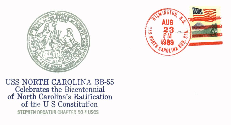 2280 | A cover canceled on August 23, 1989 at Wilmington NC. It commemorates North Carolina's ratification of the US Constitution. History: In 1789 North Carolina joined the newly formed United States of America as the 12th of the original 13 colonies. Now 200 years later North Carolina celebrated its Bicentennial of ratifying the US Constitution. The motto of the State of North Carolina is "Esse Quam Videri" which is translated "To be, rather than seem." |