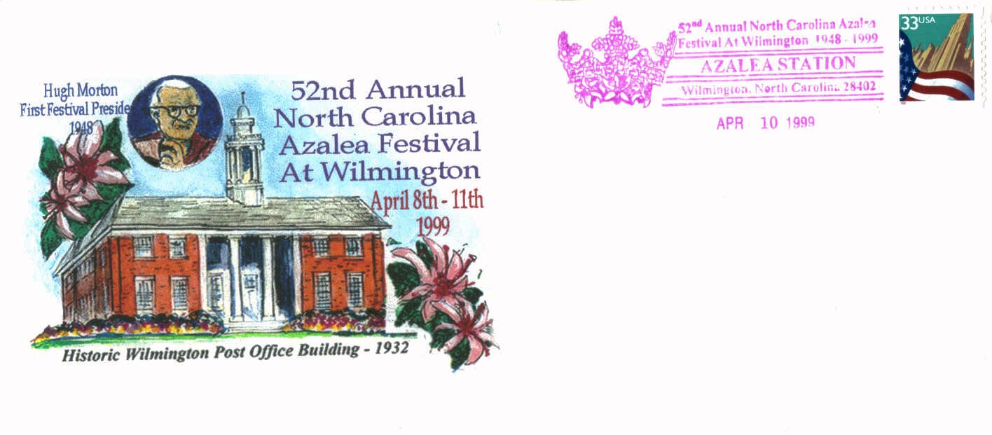 Azalea Festival" in Wilmington. This cover has a cachet of the new downtown main post office. The cornerstone of this post office was laid on September 27, 1936 and was dedicated on May 29, 1937. Its lobby contains a mural painted in 1940 by William F Pfohl depicting the historic Wilmington waterfront. History: Wilmington has been the home of the annual springtime "North Carolina Azalea Festival" which first began in 1948. The Festival is a celebration of Wilmington's exceptional azalea gardens showcasing the brilliant floral displays with which southeastern North Carolina greets the spring. Additionally, the Festival celebrates the rich history, artwork and culture of Wilmington. It is usually celebrated over five days of entertainment that now includes a parade, street fair, circus, concerts, pageantry and all that is Southern. The Festival is substantially sponsored by four major organizations including GE-Wilmington, Neuwirth Chrysler-Jeep, Progress Energy and the Wachovia Bank. This year the 61st Annual "North Carolina Azalea Festival" will be held April 9-13, 2008 in the greater Wilmington area. |