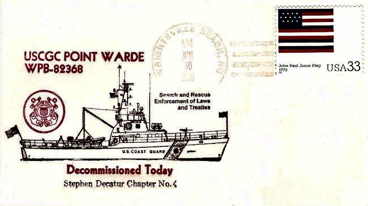 3403 | A cover canceled on June 30, 2000 at Wrightsville Beach (Wilmington NC) commemorating the decommissioning of the US Coast Guard Cutter, USCGC Point Warde (WPB-82368). History: The USCGC Point Warde was built by JM Martinac Shipbuilding in Tacoma WA and commissioned on August 14, 1967. This Point Class Cutter was an 82 foot patrol vessel first stationed at San Juan Puerto Rico from 1967 to July 1987. She was used for law enforcement and search and rescue operations establishing a noteable record of accomplishments. Of note, on September 30, 1984 she seized the F/V Three Brothers thirty miles southwest of Puerto Rico with 14 tons of marijuana on board. The Point Warde was transferred to the Coast Guard Station Wrightsville Beach NC in July 1987. She was a fast and highly maneuverable cutter capable of operating in heavy seas and used primarily for search and rescue, maritime law enforcement and interdiction of illegal drugs. Other duties included Wilmington port security and marine environmental protection. The Point Warde was decommissioned at Wrightsville Beach NC on June 30, 2000. She was then transferred to Columbia South America. |