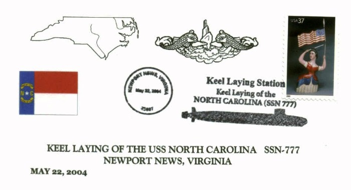 The Secretary of the Navy, Richard Danzig named the US’s newest submarine (fourth unit of the Virginia Class) for the State of North Carolina. The nuclear attack submarine, North Carolina (SSN-777) is the Navy's next-generation attack submarine with the capabilities to maintain the US’s undersea supremacy well into the 21st century. The primary responsibility for its construction was assigned to Newport News Shipbuilding and Drydock, Newport News VA with Electric Boat, Groton CT building selected modules. History: This is the fourth ship of the US Navy to carry the name North Carolina. The original was USS North Carolina (1820-1836), the second ACR-12 (1908-1921) and the third BB-55 (1940-1947). The BB-55 battleship now serves in Wilmington NC as a memorial for all North Carolinians killed in WW-II (see 1941 above). SSN-777 keel laid: May 22, 2004 SSN-777 christened: April 21, 2007 SSN-777 launched: May 5, 2007 SSN-777 commissioned in Wilmington NC: May 3, 2008 (see below) |