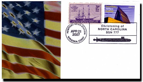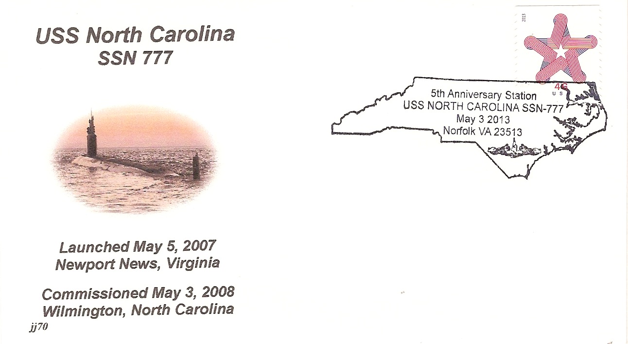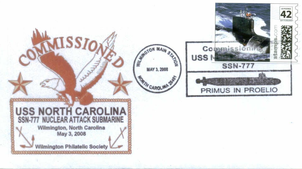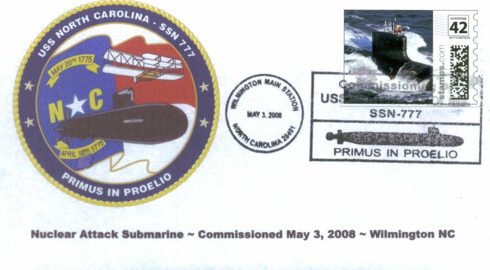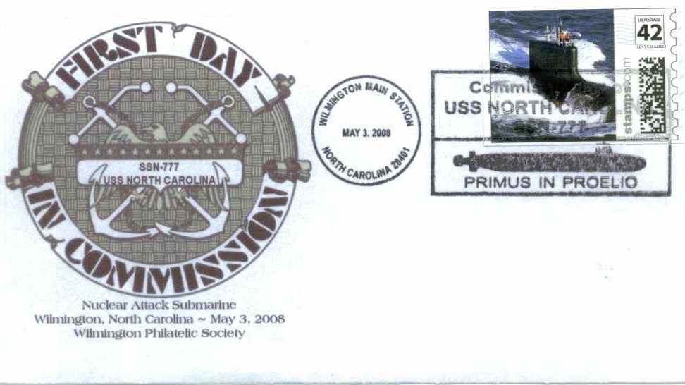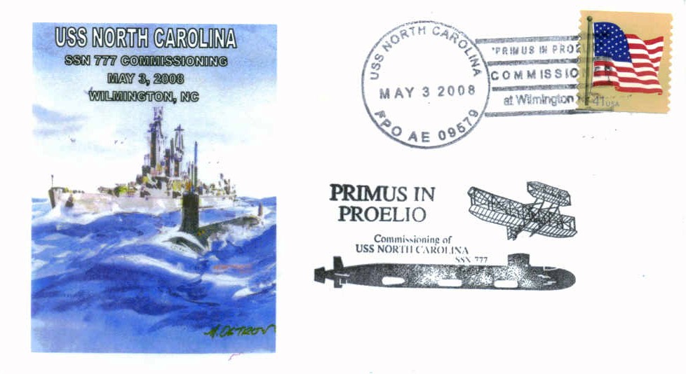 A cover sent on May 3, 2008 from Wilmington, North Carolina commemorating the commissioning of the nuclear attack submarine, the USS North Carolina (SSN-777). It has a unique US Photo Stamp (SSN-77 during sea trials) and a limited-use US Postal special cancellation containing the ship's motto, Primus in Proelio (First in Fight). These commissioning covers were issued with three different cachets. A commissioning cover prepared by the US Navy which was given to each of the 5,000 plus attendees to the Wilmington, North Carolina commissioning ceremony on May 3, 2008. History: The commissioning ceremony marks a ship's entry into active service in the US Navy. At the moment the commissioning pennant breaks the masthead, the USS North Carolina became a Navy command in her own right taking its place alongside the active ships in the US Naval fleet. Many dignitaries attended the commissioning ceremony in Wilmington NC. Amongst many congradulatory letters, President George Bush sent his congradulations. Additionally, Captain Mark Davis, Commanding Officer of the USS North Carolina (SSN-777) expressed his thanks to the shipbuilders, Northrop Grumman Newport News and General Dynamics Electric Boat, to his crew of talented sailors and to the people of the US, of North Carolina, of Wilmington, the warm and hospitable city chosen for this commissioning ceremony. A commissioning program marked this special occassion. |