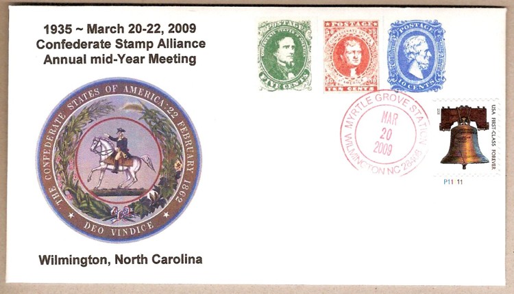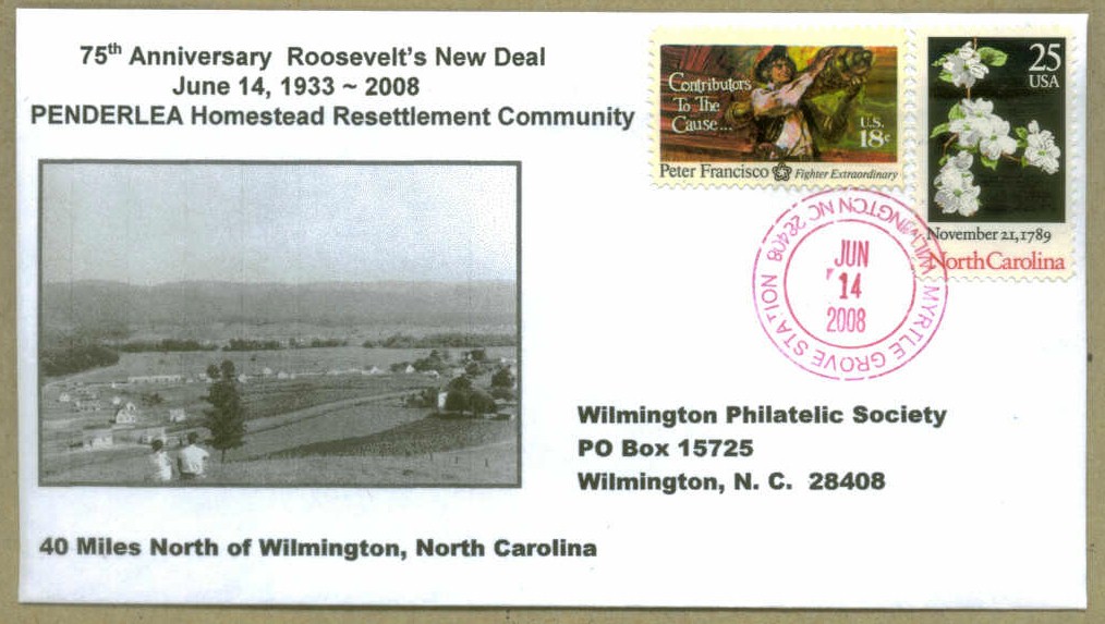 2347 & 1562 | A cover sent on June 14, 2008 from Wilmington, North Carolina commemorating the 75th Anniversary of President Roosevelt's New Deal with the Federal funding of the Penderlea Homestead Resettlement Community 40 miles north of Wilmington, NC. History: The Great Depression in the US is associated with the stock market crash on Black Tuesday, October 29, 1929. The Depression lasted until the onset of the war economy of WW-II in 1939. The Depression had devastating effects in the industrialized countries of the world as international trade declined sharply as well as personal incomes, tax revenues, prices and profits. Cities all around the world were hit hard especially those dependent on heavy industry. Construction was virtually halted and farming and rural areas suffered as crop prices fell. By spring of 1933, when Franklin D Roosevelt took the oath of office, US unemployment had risen from 8 to15 million and the US gross national product had decreased from $103.8 to $55.7 billion. Both industry and farming were severely hit by these economic downturns. FDR promoted a wide variety of federally funded programs (the "New Deal") aimed at restoring the American economy, helping relieve the suffering of the unemployed and reforming the system so that such a severe crisis could never happen again. Forty miles north of Wilmington, NC the Penderlea Homestead Resettlement Community was one of the first such communities to receive Federal funds as an experimental community of farms, businesses, churches and civic organizations. |