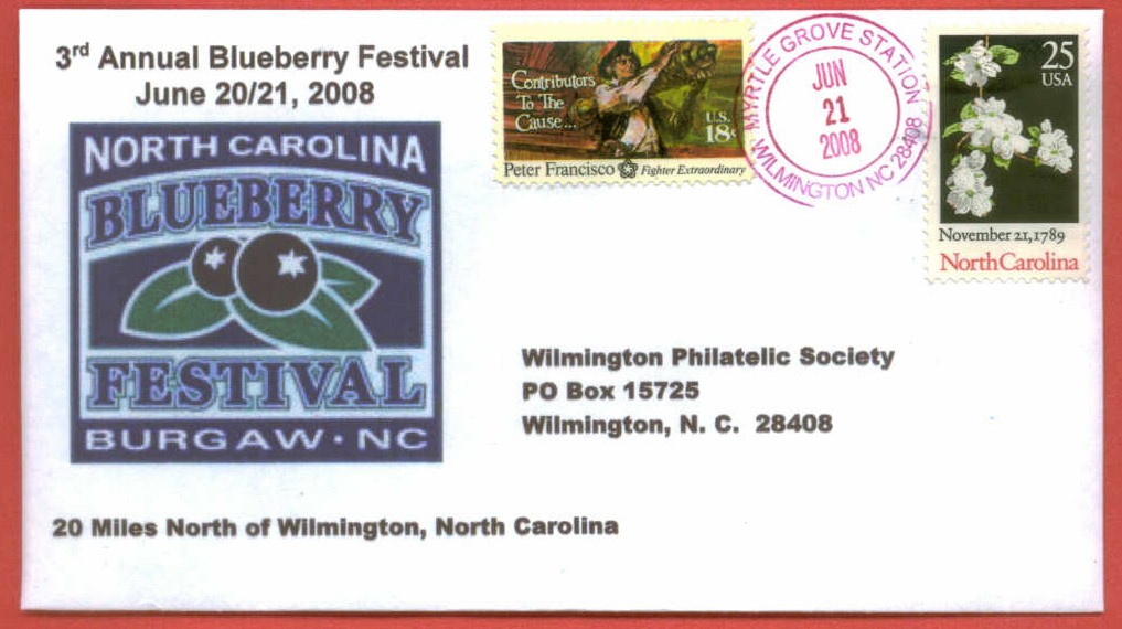 2347 & 1562 | A cover sent on June 21, 2008 from Wilmington, North Carolina commemorating the 3rd Annual Blueberry Festival held in Burgaw, 20 miles north of Wilmington, NC. History: Antioxidants protect the body against the damaging effects of free radicals and the chronic diseases associated with the aging process. Blueberries contain many of these naturally occurring antioxidants such as Vitamins C and E. In addition, blueberries contain anthocyanins and phenolics that also act as antioxidants. Anthocyanin gives blueberries their blue color and is the key component of the blueberry's antioxidant and anti-inflammatory properties. Blueberries test high in their ability to subdue free radicals. Free radicals damage cell membranes and DNA through a process known as oxidative stress and are blamed for many of the dysfunctions and diseases associated with aging. The first cultivated blueberry production in North Carolina began in the Pender County area in the 1930s. Currently, Pender County ranks second in NC's blueberry production. Twenty miles north of Wilmington, NC in Burgaw the annual North Carolina Blueberry Festival is held every year celebrating the area's bountiful harvest of blueberries. This festival has expanded celebrating the historical, economic and cultural significance of blueberries grown in southeastern North Carolina. |