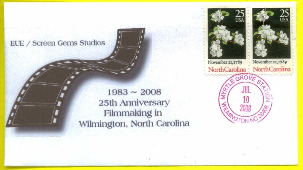 2347x2 | A cover cancelled on July 10, 2008 in Wilmington NC commemorating the 25th Anniversary of filmmaking in Wilmington NC. History: Producer, Frank Capra Jr discovered North Carolina in 1983 while searching for a home to burn down for the filming of "Fire-Starter," the Stephen King horror movie starring a young Drew Barrymore. The scene was shot at the Orton Plantation in Winnabow. Capra then persuaded his boss, executive producer Dino De Laurentiis to build a movie studio facility in Wilmington NC. Capra said, "If you can do it there, we can do it here." In 1983 De Laurentiis founded De Laurentiis Entertainment Group (DEG) and DEG Film Studios in Wilmington where he served as chairman and CEO. DEG became the largest full service motion picture facility in the United States east of California. Wilmington NC became "Hollywood East" or "Wilmywood." In 1988 De Laurentiis resigned from DEG and Screen Gems Studios took over the Wilmington movie/television studio facility. In 1997 the Cooney family bought the Wilmington studios and installed Frank Capra Jr as president of EUE Screen Gems Studios. This Wilmington motion picture/television studio has been the home to hundreds of film, television and commercial productions. It is complimented by a seasoned crew base, an active regional film commission and a large talent pool. The 48 acre studio lot has nine sound-stages, first-rate support services with on-the-lot grip and lighting facilities. |