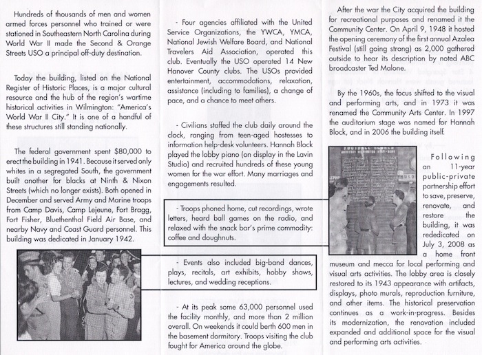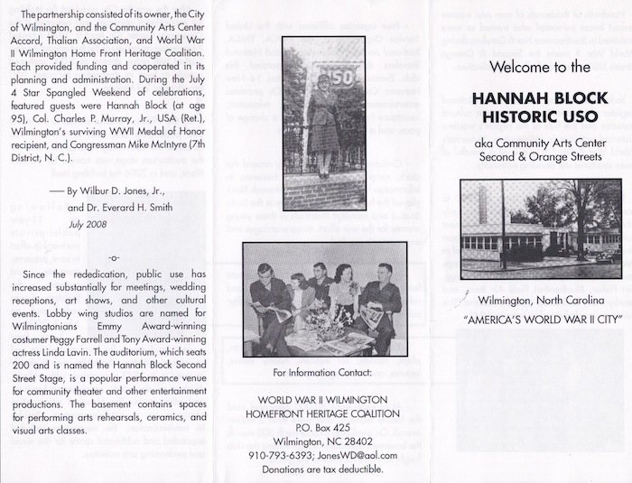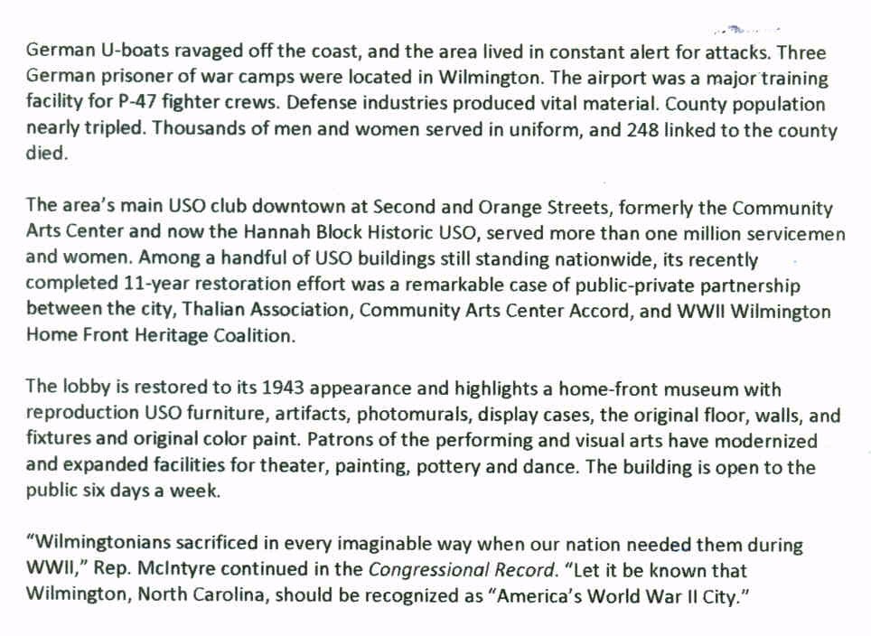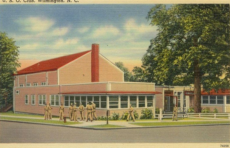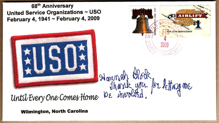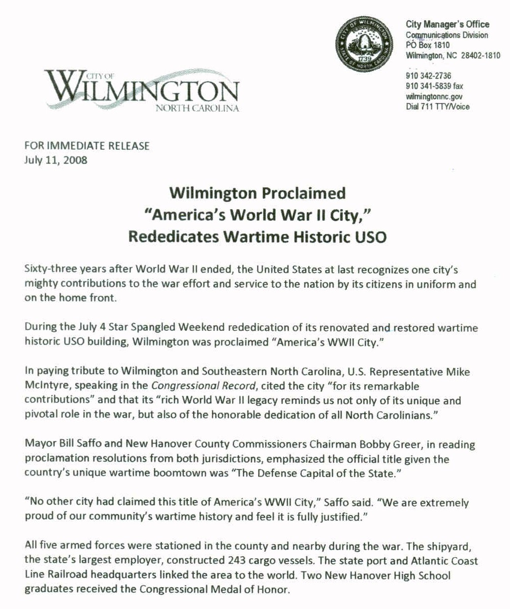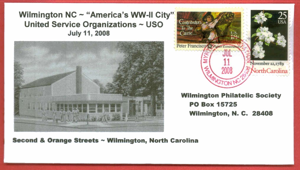 2347 & 1562 | A cover cancelled on July 11, 2008 in Wilmington NC celebrating the proclamation that Wilmington is "America's WW-II City." The July 4th Star-Spangled week centered around the re-dedication of the renovated and restored United Service Organizations (USO) Center building on the corner of Second & Orange Streets in Wilmington NC. The Wilmington USO Center was a "Home Away From Home" on the home front serving more than one million servicemen and women through the duration of WW-II. History: There was a build-up of the US military as the threatening WW-II situation intensified. President Franklin D Roosevelt wanted to provide morale and recreation services for US uniformed military personnel. Six civilian agencies including the Salvation Army, YMCA, YWCA, NCCS (National Catholic Community Service), NTAA (National Travelers Aid Association) and the NJWB (National Jewish Welfare Board ) pooled their resources and the United Service Organizations (USO) was incorporated in New York on February 4, 1941. USO centers and clubs quickly opened around the world as a "Home Away from Home" for GIs. The local USO was a place to go for dances and social events, for movies and music, for a quiet place to talk or write a letter home, or for a free cup of coffee and an egg. To support the servicemen and women stationed or training in Southeastern North Carolina, a USO Center was opened in Wilmington a few days before the attack on Pearl Harbor on December 7, 1941 . The Wilmington USO Center (then & now) is listed on the National Register of Historic Places and is one of a handful USO structures still standing in the US. It is an arts resource and a hub of the region's legacy supporting Wilmington's designation as "America's WW-II City." It has been restored to its wartime appearance and is a home-front museum. Wilmington News Release - Page 2 |