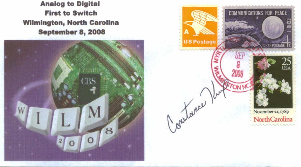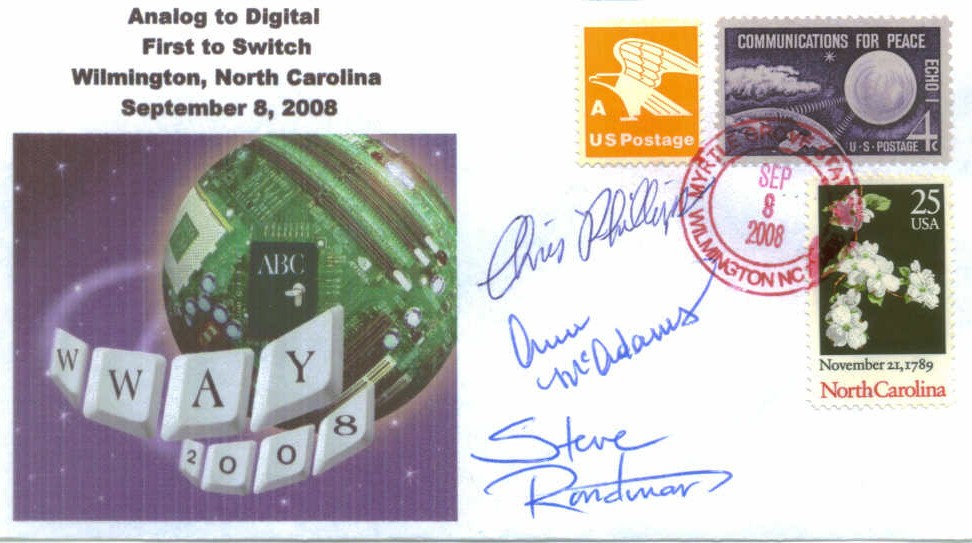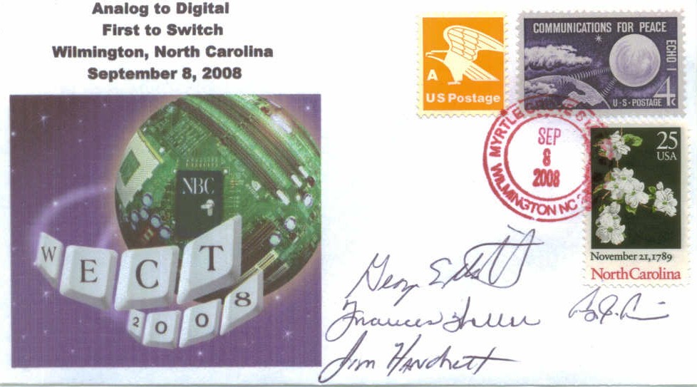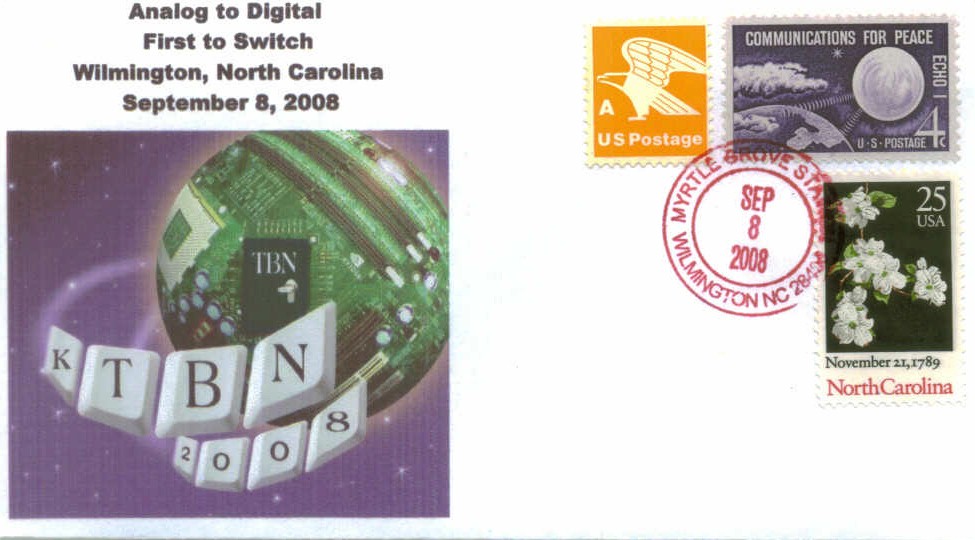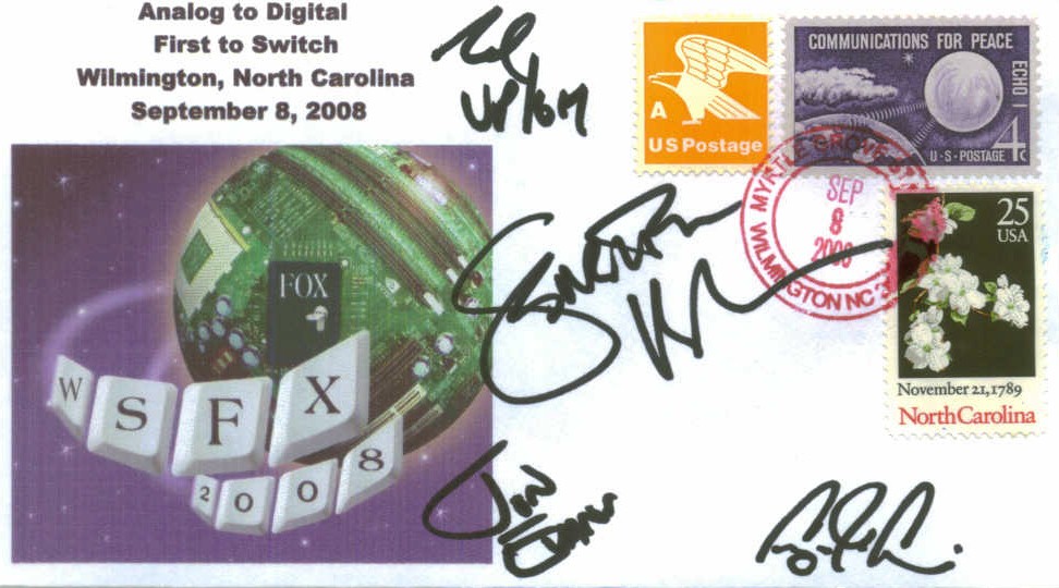 A series of five covers canceled on September 8, 2008 in Wilmington NC commemorating Wilmington NC as the first US market to switch from analog to digital TV broadcasting. History: In 1996 Congress authorized the distribution of an additional broadcast channel to each US broadcast TV station so that they could start a digital broadcast channel while simultaneously continuing their analog broadcast channel. Congress mandated that February 17, 2009 would be the last day for full-power television stations to broadcast in analog. After that date all full-power television stations would broadcast in digital only. A benefit of the switch to all-digital broadcasting would free up parts of the broadcast spectrum to be used for improved public safety communications (police, fire department and rescue squads). The public would also benefit because digital broadcasting would allow stations to offer improved picture and sound quality as digital is much more efficient than analog. The Federal Communications Commission searched for a representative community to initiate a trial program to work out any possible problems before the February 17, 2009 national switch from analog to digital. The FCC chose Wilmington, North Carolina as the first city in the US to switch from analog to digital, 162 days (5+ months) in advance of the national switchover. On September 8, 2008 five full-power TV stations in Wilmington NC will be the first in the US to switch from analog to digital. WSFX FOX WWAY ABC WILM CBS KTBN TBN |