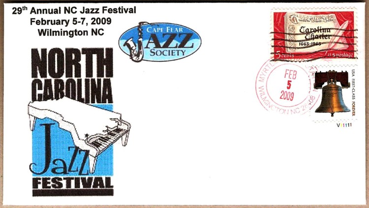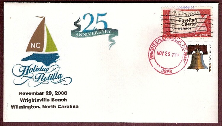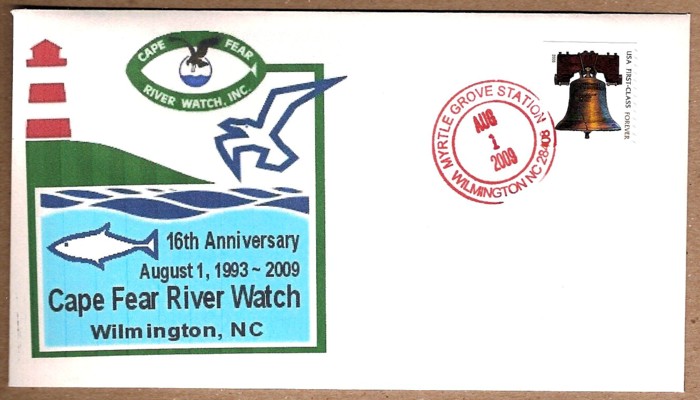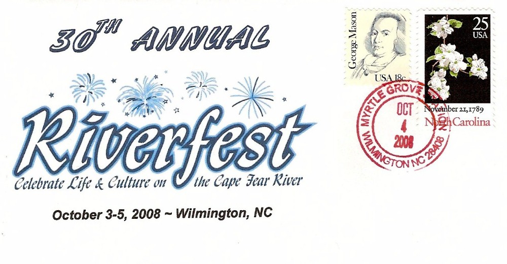 A cover cancelled on October 4, 2008 in Wilmington NC commemorating the 30th annual Riverfest in Wilmington. History: The Cape Fear River was originally called the Jordan River. It is formed at Haywood NC by the confluence of the Deep and Haw Rivers just below Jordan Lake in central North Carolina. After a series of rapids, the river becomes navigable at Fayetteville through a series of locks and dams. It flows about 195 miles entering the Atlantic Ocean three miles west of Cape Fear. As it nears the ocean, it becomes a slow coastal river. Below Wilmington NC, the Cape Fear River is a coastal estuary separating the mainland of North Carolina from its barrier islands where it becomes a segment of the Intracoastal Waterway route. During the colonial era, the river provided a principal transportation route to the interior of North Carolina. The colonial township of Wilmington was incorporated on the Cape Fear River in 1739. Wilmington and its river became intra-dependent. One of the ways the citizens of Wilmington show their appreciation of their river is through Riverfest. The festival of Riverfest was first celebrated in Wilmington NC in 1979. At that time there were four concessions, trolley rides and fireworks. Riverfest was a roaring success that would be repeated annually. On the first weekend of October (10/3-5/2008) Wilmington celebrates the 30th annual Riverfest. To accomplish this celebration, twenty plus committees, over 300 volunteers and a budget of $80,000 are being allocated in conjunction with over 160 craft vendors, 25 concessions, entertainment on two stages, fireworks, the Great Waiter's Wine Race, Run the River, exhibits and a Kids Zone. Riverfest is free-family entertainment over a fun-packed weekend on a fun-filled half mile on the waterfront of the Cape Fear River in downtown Wilmington. Celebrate life & culture on the Cape Fear River. |