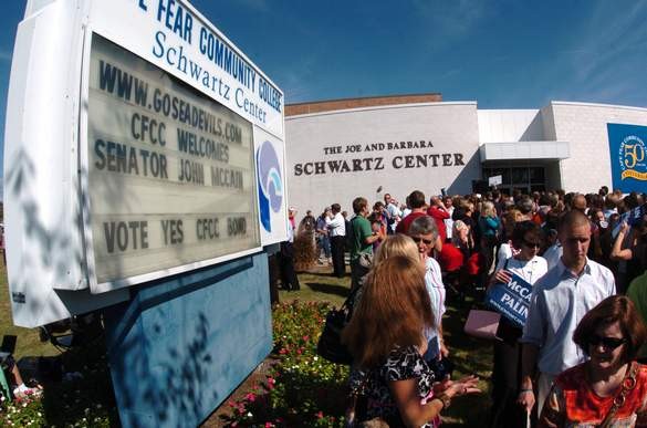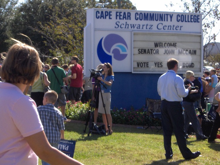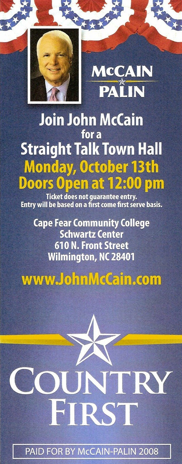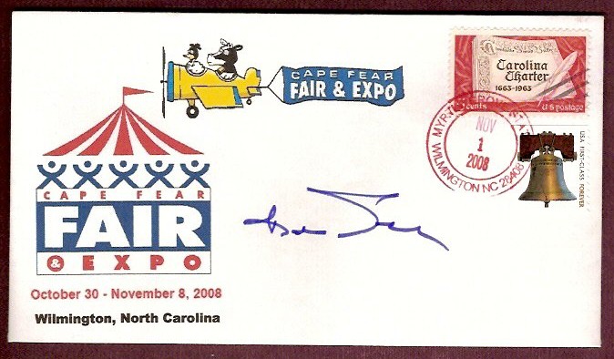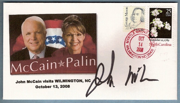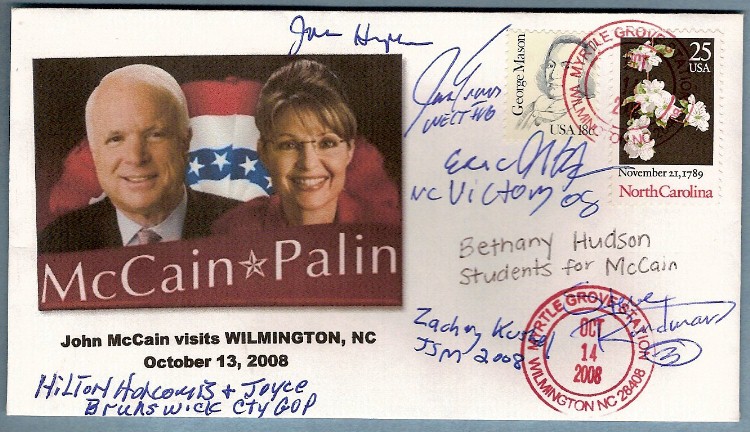 Covers cancelled on October 14, 2008 in Wilmington NC commemorating the October 13th visit of Senator John McCain and his wife, Cindy to Wilmington NC for a Country-First-Election Rally at the Cape Fear Community College Schwartz Center. The top cover is autographed by John McCain while the bottom cover is autographed by several local Republican leaders and Wilmington TV News personalities.