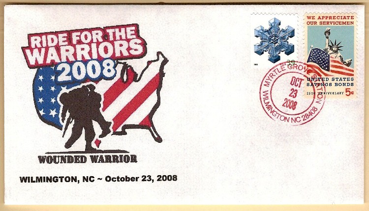 A cover cancelled on October 23, 2008 in Wilmington NC commemorating the third Wounded Warrior Soldier Ride in Wilmington. History: The third Wilmington NC Wounded Warrior Soldier Ride raised awareness building camaraderie between injured servicemen and women and the Wilmington community. Wounded combat veterans received a hero's welcome into downtown Wilmington NC on Thursday, October 23, 2008. These warriors who have been injured in combat have a long and hard rode to rebuild and reconnect their lives. The rehabilitative cycling program is a way for these combat-wounded vets to focus on the positive and create a support network. The Wilmington Soldier Ride is one of seven regional bike rides across cities in the United States. Pix #1 Pix #2 Pix #3 Pix #4 |