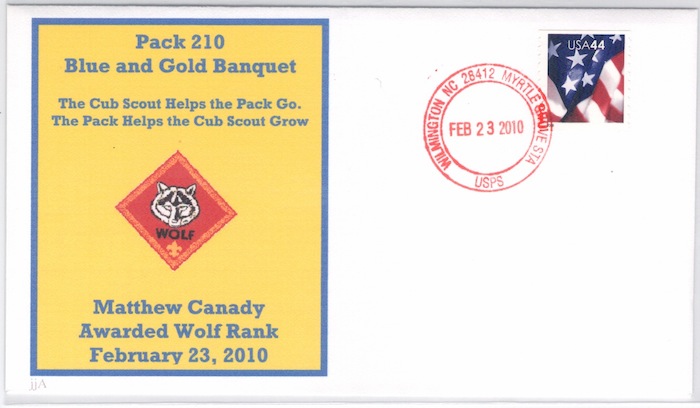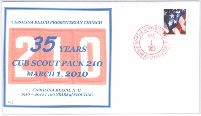 4391 | (Top) A cover cancelled on March 1, 2010 in Wilmington NC commemorating both the 100th anniversary of the Boy Scouts of America and the 35th anniversary of Carolina Beach Cub Scout Pack 210. (Bottom) A cover cancelled on February 23, 2010 in Wilmington NC recognizing the award of Wolf rank to Matthew Canady at the "Blue & Gold Banquet." History: In 1909 Chicago publisher, WD Boyce visited London where he learned of the scouting movement. On his return to the US, he incorporated the "Boy Scouts of America (BSA)" on February 8, 1910. At its incorporation the stated purpose of the BSA was "to teach boys patriotism, courage, self-reliance and kindred values. The current mission statement of the BSA is "to prepare young people to make ethical and moral choices over their lifetimes by instilling in them the values of the Scout Oath and Law." Scout OathOn my honor, I will do my bestTo do my duty to God and my country; To obey the Scout Law; To help other people at all times; To keep myself physically strong, mentally awake and morally straight. Scout LawA Scout is trustworthy, loyal, helpful, friendly, courteous, kind, obedient, cheerful, thrifty, brave, clean and reverent.Scout MottoBe PreparedScout SloganDo a good turn daily![]() Scouting began in Wilmington as early as October 1911. In September 1914 Odis B Hinnant arrived in Wilmington to become the director of the YMCA’s Boys’ Department where he established Scouting as a major youth program. Odis served as the Scouting Commissioner until his departure from Wilmington in April 1926. On March 17, 1916 the five Wilmington scout troops held their first annual banquet at the YMCA building. Following the banquet, the Wilmington Council, BSA was organized with BA Merritt as its first president. On October 4, 1926 Floyd Griffith became the first Scout Executive of the newly renamed New Hanover County Council. It’s charter was received on July 18, 1927. On September 29, 1928 the charter for the renamed Wilmington Area Council was received and on July 1, 1929 the Cape Fear Area Council was formed. Today the Council operates with six Districts; Western, Central, Lakes, Masonboro, Northeast Cape Fear and Brunswick. The BSA operates through dens, packs and troops sponsored and operated by churches, clubs, civic associations, educational organizations, etc. These are led by volunteers who are supported by local councils using both paid professionals and volunteers. For younger boys (from the first to fifth-grades - 5 to 11 years) a program of Cub Scouting was formed. It was designed to have the boys doing things while pursuing their character development, citizenship training and personal fitness. It is broken down into age-based levels of Tiger Cubs, Wolf, Bear, and Webelos Scouts. Carolina Beach Scout Pack #210 celebrated its 35th anniversary on March 10, 2010. |