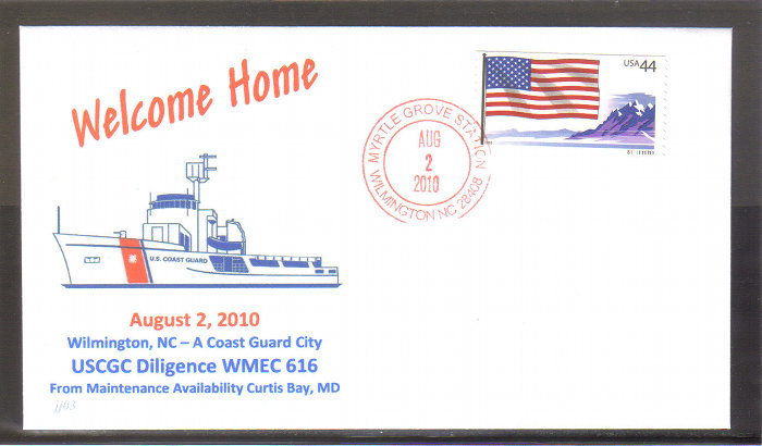 4303 | A cover cancelled on August 2, 2010 in Wilmington NC commemorating the return of the USCGC Dilligence (WMEC 616) to Wilmington from Custis Bay MD where she underwent scheduled maintenance. History: See above cover dated July 25, 2008 |