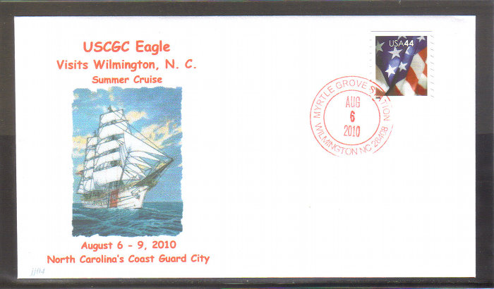 4392 | A cover cancelled on August 6, 2010 in Wilmington NC documenting the visit of the USCGC Eagle to Wilmington. History: Blohm & Voss in Hamburg, Germany laid the ship’s keel on February 15, 1936. She was launched on June 13th, completed on September 16th and commissioned as the SSS Horst Wessel on September 17, 1936. Her name was given in tribute to Nazi party member, Horst Wessel. Adolf Hitler and Rudolph Hess were present at her launch and christening. Initially she was commanded by Captain August Thiele and was home-ported in Kiel, Germany where she served as the flagship of the Kriegsmarine sail training fleet. In the years before the start of WW-II she undertook numerous training cruises in European waters and visited the Caribbean. She was decommissioned in 1939 at the onset of the war but served as a docked training ship until her recommissioning in late 1942. At the end of WW-II she was distributed as a war reparation to the United States. On May 15, 1946 she was commissioned into the US Coast Guard and sailed across the Atlantic Ocean to Orangeburg, NY before being assigned to her home port in New London, CT. The Eagle, known as America’s Tall Ship is stationed at the US Coast Guard Academy on the Thames River in New London CT. Captain Eric C. Jones is the Commanding Officer of the USCGC Eagle. On training missions she carries a complement of 12 officers and a crew between 68 and 150 cadets. Each year she takes one long training cruise to the Caribbean, the Pacific Coast or Europe and two shorter cruises along the US East Coast. 2010 Summer Schedule Mar 7 Mayport, FL Mar 31 Arrive New London, CT April 30 Depart New London, CT May 7 San Juan, Puerto Rico May 19 Cartagena, Colombia May 28 Willemstad, Curacao N.A. June 11 Cozumel, Mexico June 23 Veracruz, Mexico July 2 Corpus Christi, TX July 10 Tampa, FL July 23 Port Everglades, FL July 30 Savannah, GA Aug 6 Wilmington, NC Aug 13 Arrive New London, CT |
