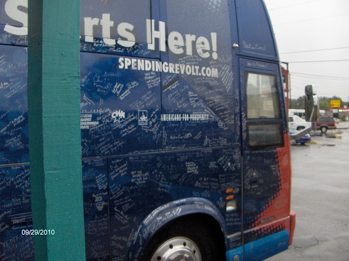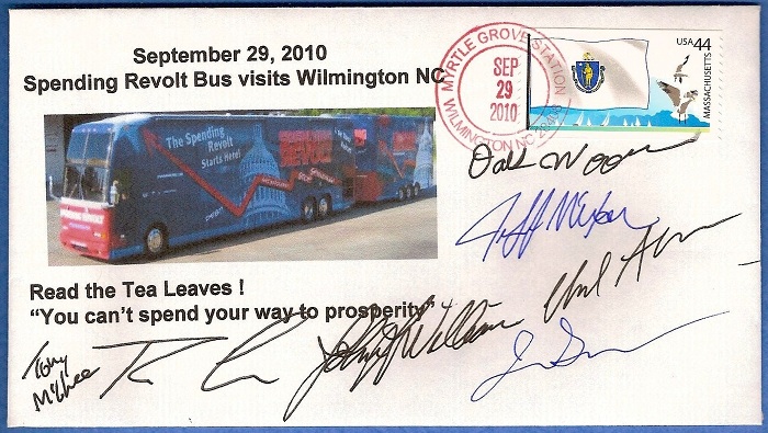 4297 | A cover cancelled on September 29, 2010 in Wilmington NC commemorating the visit to Wilmington of the "Spending Revolt" Bus. It bears the autographs of several of the participating organizations/people detailed below. History: The Spending Revolt is a broad coalition of taxpayers, business owners, women, families and policy organizations focused on breaking the cycle of spending dependency in Washington. It is dedicated to educating and engaging citizens on the mounting federal debt, fiscal policy and government spending. Americans for Prosperity (AFP) is an organization of grassroots leaders who engage citizens in the name of limited government and free markets on the local, state and federal levels. They are committed to educating citizens about economic policy, mobilizing those citizens as advocates in the public policy process and championing the principles of entrepreneurship, fiscal and regulatory restraint. The John Locke Foundation (JLF) is an independent, nonprofit think-tank that works “for truth, for freedom and for the future of North Carolina." It employs research, journalism and outreach programs to transform government through competition, innovation, personal freedom, and personal responsibility. It seeks a better balance between the public sector and private institutions of family, faith, community and enterprise. We The People of NC (Brunswick County) is a coalition of NC residents who want "To promote and restore Faith and Trust in all levels of government by re-establishing the principles of our founding fathers." It's goals are to "educate patriots on current issues to raise public awareness, to inspire patriotic citizens to promote traditional values of life, liberty and the pursuit of happiness and to empower us as individuals to influence government to operate within Constitutional Limits." The Tea Party movement is a grassroots explosion of righteous anger and resolute activism. It strives to prevent America from losing its constitutional traditions of individual liberty and limited government. Rick Catlin is a neighbor, business owner, environmental engineer, public servant, volunteer, husband, father, grandfather who has spent his life trying to make a difference. He is looking forward to serve the citizens of New Hanover County as their new County Commissioner. "The BIG Talker" news-talker radio (93.7 & 106.3 FM) provided a remote feed with host, Chad Adams (The Morning Beat) discussing issues facing our community, our State and the Nation while bringing you the latest news. Driver/Owner of the Spending Revolts Bus is John L Williams. His John L Productions focuses on political campaign bus tours. The Spending Revolt Bus visited Wilmington NC on September 29, 2010 for a patriotic stop-over rally held at "Captain Bills Banquet Facility" at 4240 Market Steeet. This "Spending Revolt" bus tour has visited many states and many more cities across the United States. On every outer surface of the bus are signatures of patriotic Americans who have..... "Read the Tea Leaves" and understand that..... I pledge to do all within my power to protect and defend the Constitution of the United States of America. I pledge to vote in every election, and only for candidates who have proven their loyalty to our country, traditional moral values, and the Constitution of the United States of America. I pledge to expend my time, money, and effort to lawfully remove from elected or appointed office any person who has shown themselves unresponsive to the will of the people. I pledge to work with all fellow citizens and patriots on every front in advancing the cause of liberty and freedom. I pledge to teach my children and fellow man about the history and greatness the United States of America. I pledge to speak out and speak up whenever I hear someone promoting a non-democratic or un-American ideal or goal. I pledge to rely on myself, my family, my fellow man, and my God and I will never turn to the government to take care of me. I pledge to love my country and to stand strong and unmoved when the winds of adversity blow. Pix #1 Pix #2 Pix #3 Pix #4 Pix #5 Pix #6 Pix #7 Pix #8 Pix #9 Pix #10 Pix #11 Pix #12 Pix #13 Pix #14 Pix #15 Pix #16 Pix #17 Pix #18 |