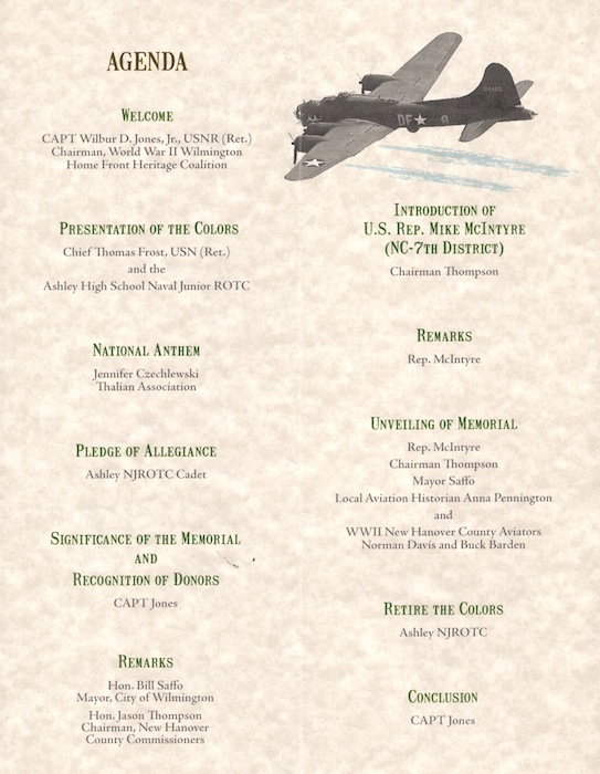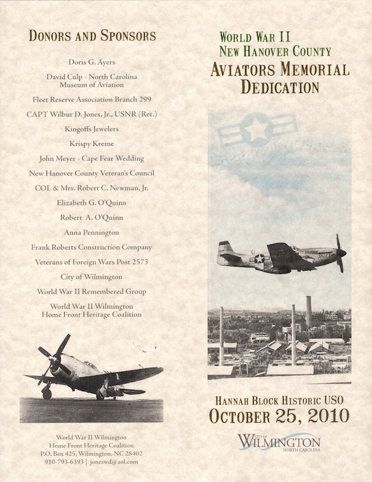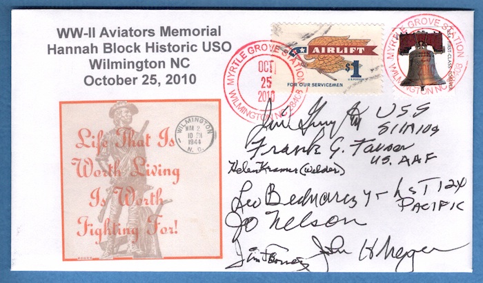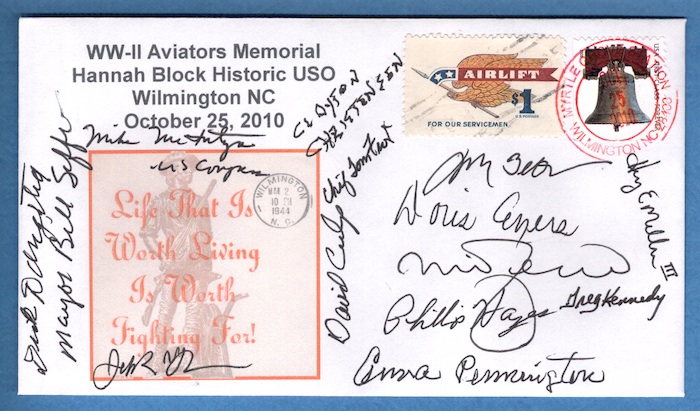 A pair of covers cancelled on October 25, 2010 in Wilmington NC commemorating the dedication of the "WW-II New Hanover County Aviator's Memorial" at the Hannah Block Historic USO. The covers are autographed by WW-II veterans and dignitaries. History: On July 11, 2008 it was proclaimed that Wilmington is "America's WW-II City" (see 2008 cover above). Two years later the WW-II Wilmington Home Front Heritage Coalition dedicated the “WW-II New Hanover County Aviator’s Memorial” at the Hannah Block Historic USO. This memorial recognizes more than 120 County residents who were pilots, bombardiers, navigators and crewmen who flew for the Army Air Force, Navy, Marine Corps and Coast Guard in WW-II. Sadly, 39 of these US military personnel gave their lives for the freedom we have in these United States. The dedication ceremony was attended by many veterans and their spouses along with many concerned Wilmington residents. Mike McIntyre (7th District, NC), Bill Saffo (Mayor) and Jason Thompson (Chairman, County Commissioners) spoke to the dedication audience, while Captain Wilbur Jones was the MC for the event program. WW-II aviators, Norman Davis and Buck Barden and local aviation historian, Anna Pennington unveiled the memorial. Hannah Block Historic USO Flyer Page 1 & Page 2 Pix #1 Pix #2 Pix #3 Pix #4 Pix #5 Pix #6 |