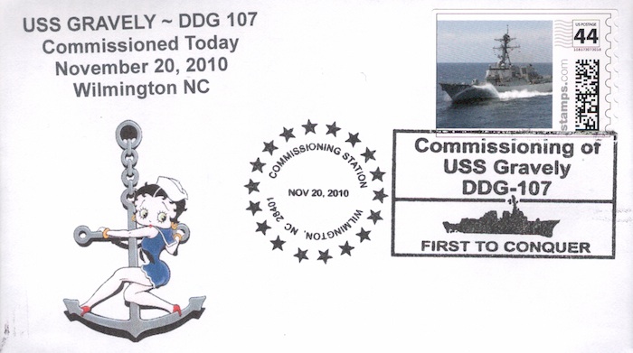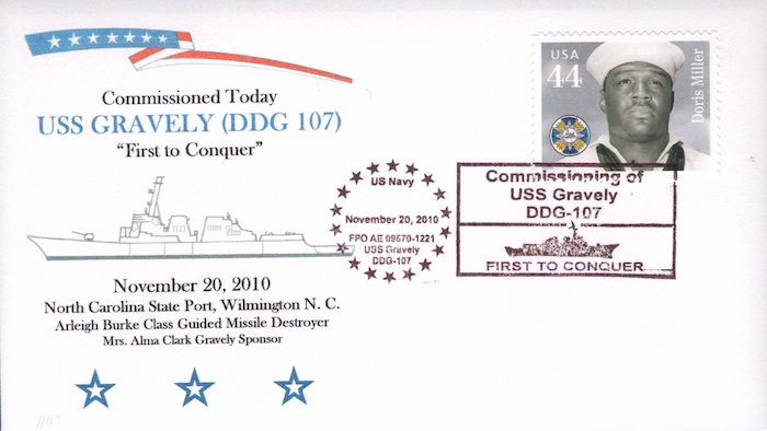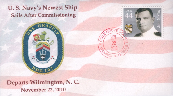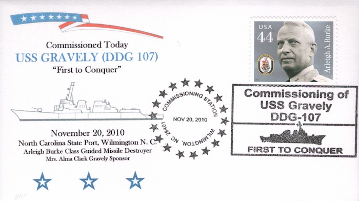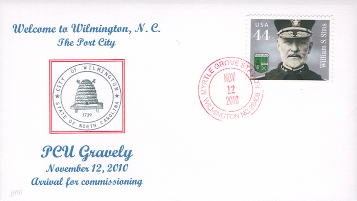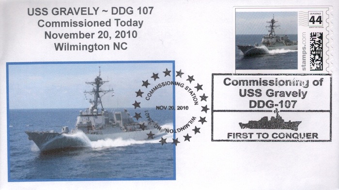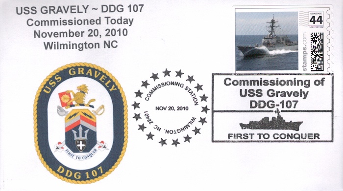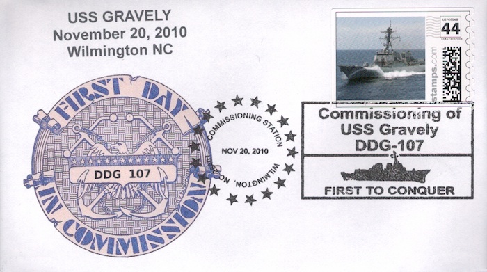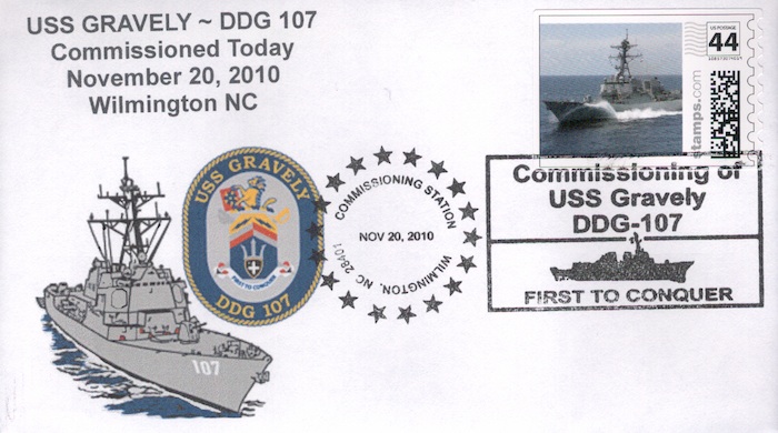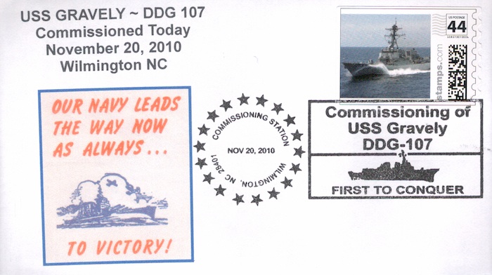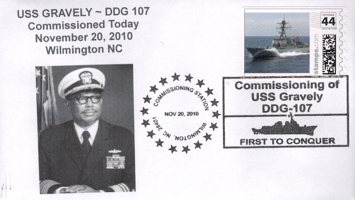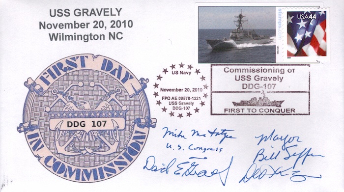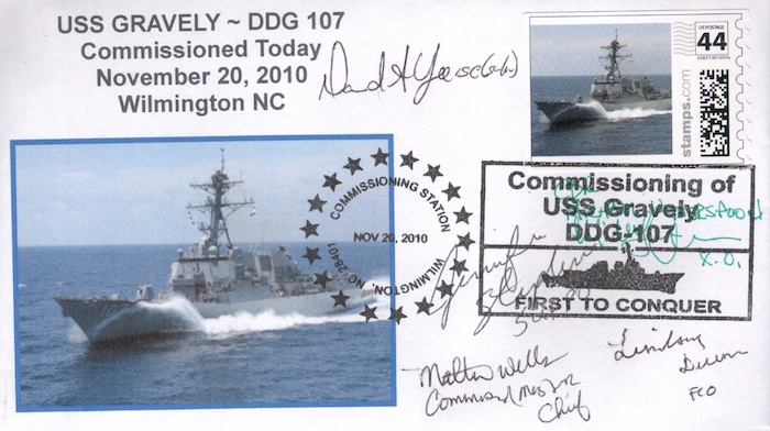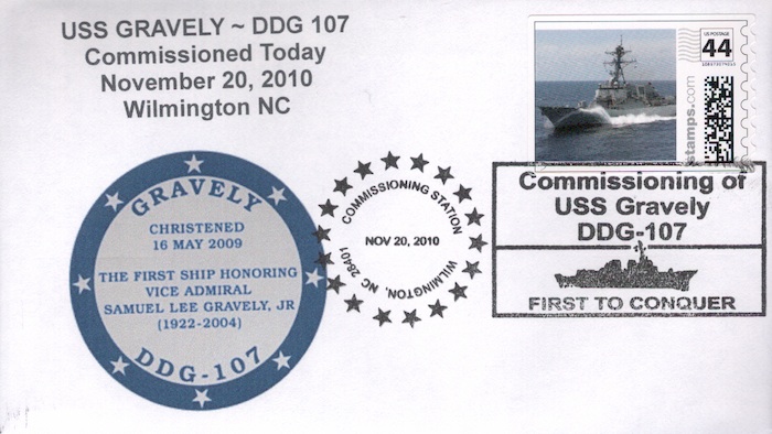 ![]() The above cover is autographed by Lieutenant Jennifer Stephens (USS Gravely Supply Officer) and other members of the Gravely crew. ![]() The above cover is autographed by Captain Douglas W Kunzman (USS Gravely Commander), Mike McIntyre (US Congressman), Bill Saffo (Mayor of Wilmington) and David Gravely (son of Vice Admiral Samuel L Gravely). This cover is franked with a unique US Photo NetStamp Label (DDG-107 during sea trials) and a limited-use Ship Postal special cancellation containing the ship's motto, "First to Conquer." History: The commissioning ceremony marks a ship's entry into active service in the US Navy. At the moment the commissioning pennant breaks the masthead, the USS Gravely became a Navy command in her own right taking its place alongside the active ships in the US Naval fleet. Many dignitaries attended the commissioning ceremony in Wilmington NC. Speakers included US Senator - Kay Hagan, Captain Ronald Wells, US Congressman - Mike McIntyre, Rear Admiral - David Lewis, Northrop Grumman Shipbuilding General Manager - Irwin Edenzon, Vice Admiral - DC Curtis, Assistant Secretary of the Navy - Sean Stackley, Admiral - Gary Roughead and Sponsor - Mrs Alma Gravely with her son, David. Wilmington Mayor - Bill Saffo and his wife, Renee welcomed the USS Gravely to Wilmington. Captain Douglas W Kunzman, Commanding Officer of the USS Gravely (DDG-107) expressed his thanks to the shipbuilders, Northrop Grumman Shipbuilders/Supship Gulf Coast, to his crew of talented sailors and to the people of the US, of North Carolina, of Wilmington, the warm and hospitable city chosen for this commissioning ceremony. Kunzman’s oldest son, Derek did a fly-over in a Navy EA-6B Prowler. aircraft. Commander Kunzman gave special recognition to the ship’s sponsor, Alma Gravely and to her late husband, Vice Admiral Samuel L Gravely. Gravely was the first African-American commissioned from the Navy Reserve officer Training Corps. He was the first African-American to command a US Navy warship (Theodore E Chandler), the first African-American to command a warship in combat (Taussig), the first African-American to rise to the rank of Vice Admiral and the first African-American to command a US Fleet (US 3rd Fleet). A commissioning program marked this special occassion. A pair of covers, documenting the arrival (November 12th) and departure (November 22nd) of the USS Gravely to and from Wilmington, North Carolina. A pair of covers canceled on November 20, 2010 in Wilmington, NC commemorating the commissioning of the USS Gravely. |