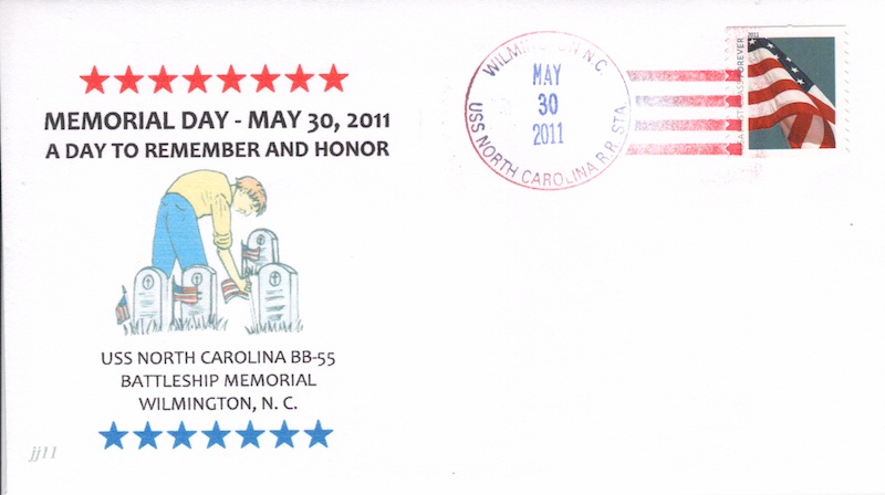 4489 | A cover cancelled on board the Battleship North Carolina on Memorial Day, May 30, 2011. History: Memorial Day, originally called Decoration Day is a day of remembrance for those who have died in our nation's service. It is currently observed on the last Monday of May. Memorial Day was officially proclaimed on May 5, 1868 by General John Logan, national commander of the Grand Army of the Republic and was first observed on May 30, 1868, when flowers were placed on the graves of Union and Confederate soldiers at Arlington National Cemetery. By 1890 it was recognized by all of the Northern states. The South honored their dead on separate days until after WW-I when the holiday changed from honoring just those who died fighting in the Civil War to honoring Americans who died fighting in any war. In the National Holiday Act of 1971, Congress created a three day Memorial weekend holiday at the end of May. It set aside a time for the nation to get together to remember, reflect and honor those who have given their all in service to their country. Flag waving Americans visit cemeteries or memorials, hold family gatherings and participate in parades. Amongst many Memorial events in Wilmington, a traditional observance was held at the Battleship North Carolina. It included a guest speaker, an all-service color guard, a 21-gun salute by the Marine Corps Honor Guard, a military band, taps and the placing of a memorial wreath. |