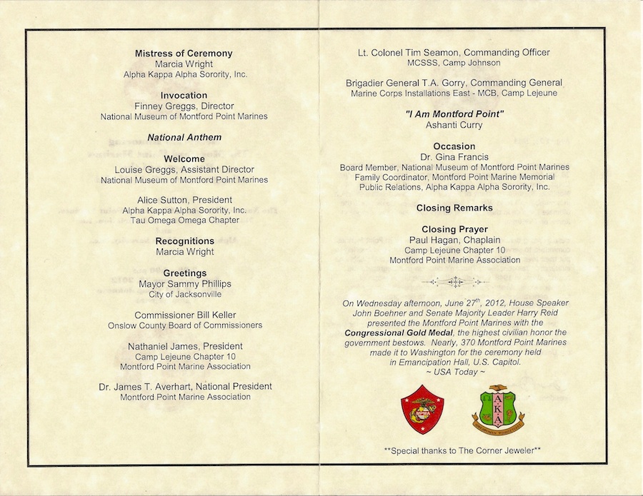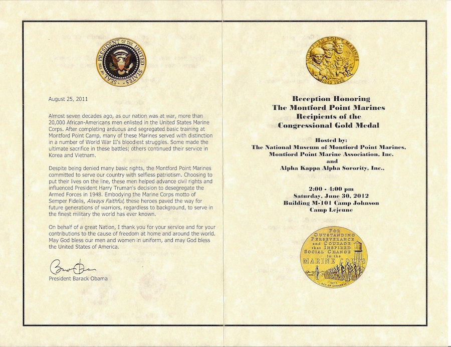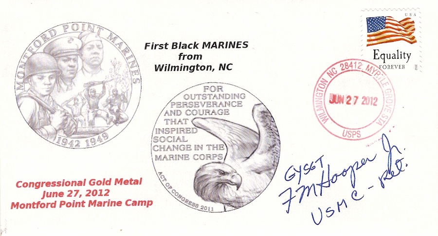 Equality | A cover cancelled on June 27, 2012 in Wilmington NC commemorating the Congressional Gold Medal award to the first Black marines (from Wilmington NC) to enter the US Marine Corps at the Montford Point Marine Camp. The cover is autographed by FM Hooper Jr (Montford Pointer, USMC retired). History: President, Franklin D Roosevelt issued Executive Order #8802 on June 25, 1941 establishing the fair employment practice that began to erase discrimination in the Armed Forces. Brigadier General, Keller E Rocher headed a board organized to study the integration of Blacks into the military. Later in 1942 Roosevelt issued a directive allowing Blacks the opportunity to be recruited into the Marine Corps. Instead of being assigned to Marine boot camps at Paris Island SC or San Diego CA, the Blacks were segregated with basic training at the Montford Point Camp adjacent to Camp Lejeune NC. Between 1942/49 approximately twenty thousand Black Marines received their basic training at Montford Point and became known as the Montford Pointers. Regardless of race, color or creed, the Montford Pointers were US Marines. President, Harry S. Truman issued Executive Order #9981 in July 1948 ending segregation in the Armed Forces. The Montford Point Camp was deactivated in September, 1949. On April 19, 1974 it was renamed Camp Johnson in honor of the late Sergeant Major, Gilbert "Hashmark" Johnson. Johnson was one of the first Blacks to join the Marines becoming a drill instructor and veteran of both WW-II and Korea. Camp Johnson is the only Marine Corps installation whose namesake honors Black heritage. A contingent of Montford Pointers from Wilmington NC received the Congressional Gold Medal in Washington DC on June 27, 2012. Included were Wilmingtonians, FM Hooper Jr, James Wilson, Ivan LeBlanc, Howard Spencer and Wilson Thigpen. |