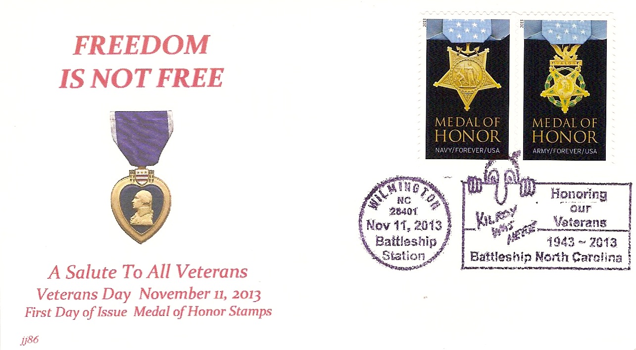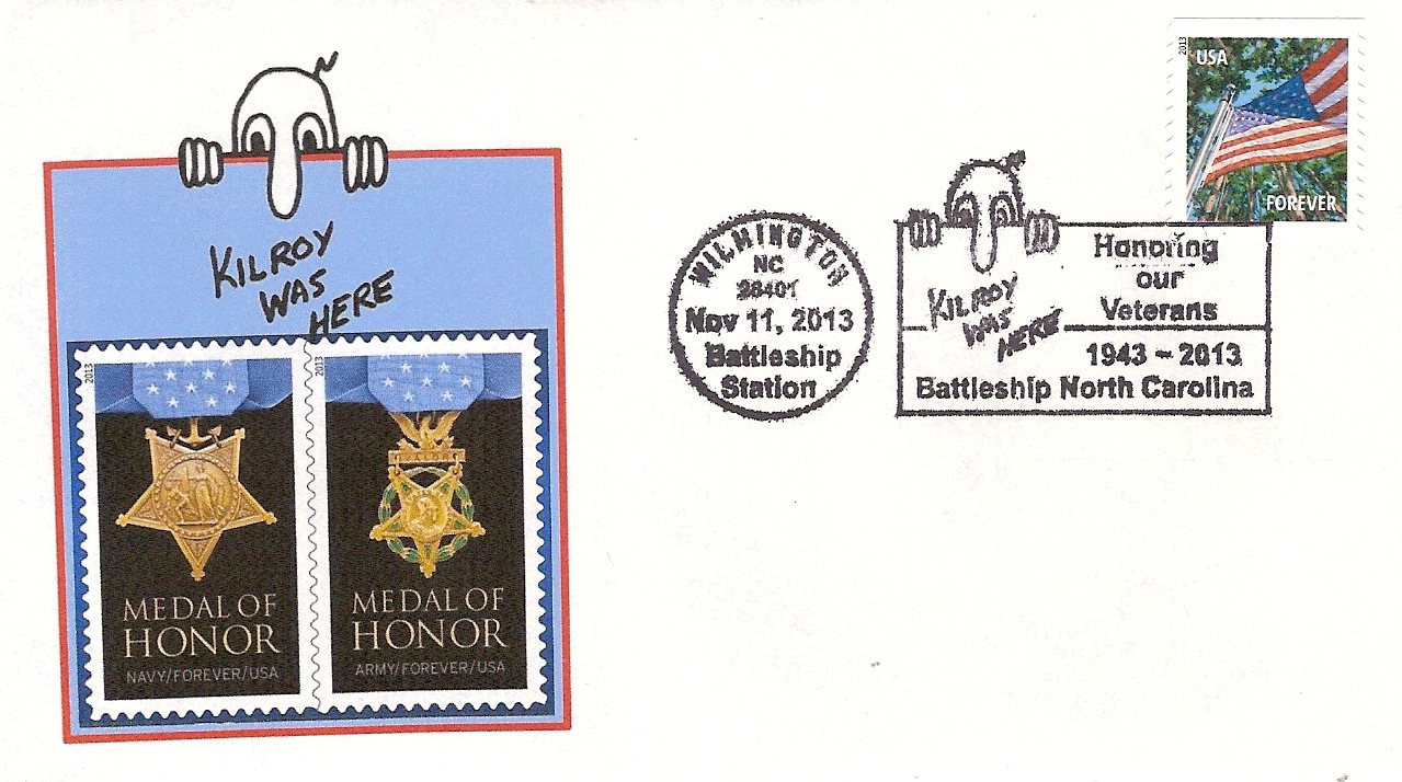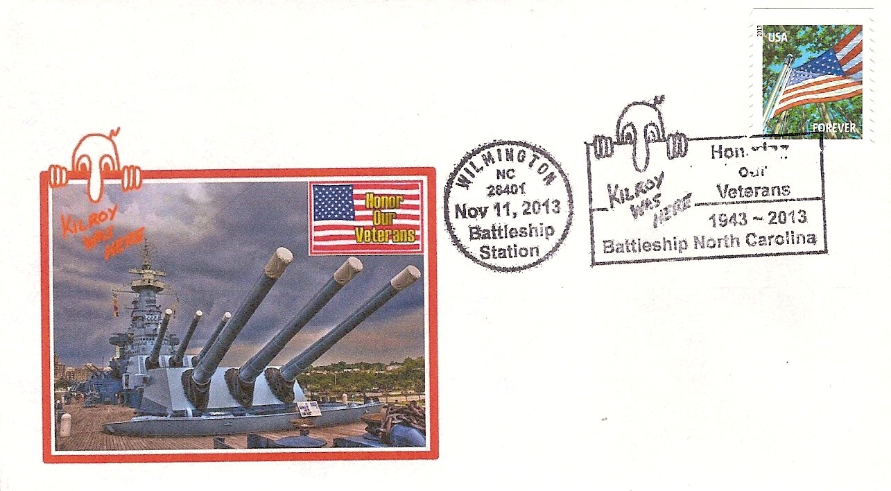 NC commemorating Veteran's Day with a special pictorial postmark (Kilroy was Here) for the Battleship North Carolina's salute to all veterans.