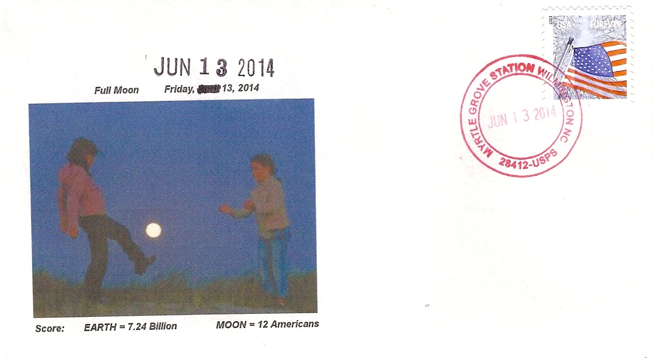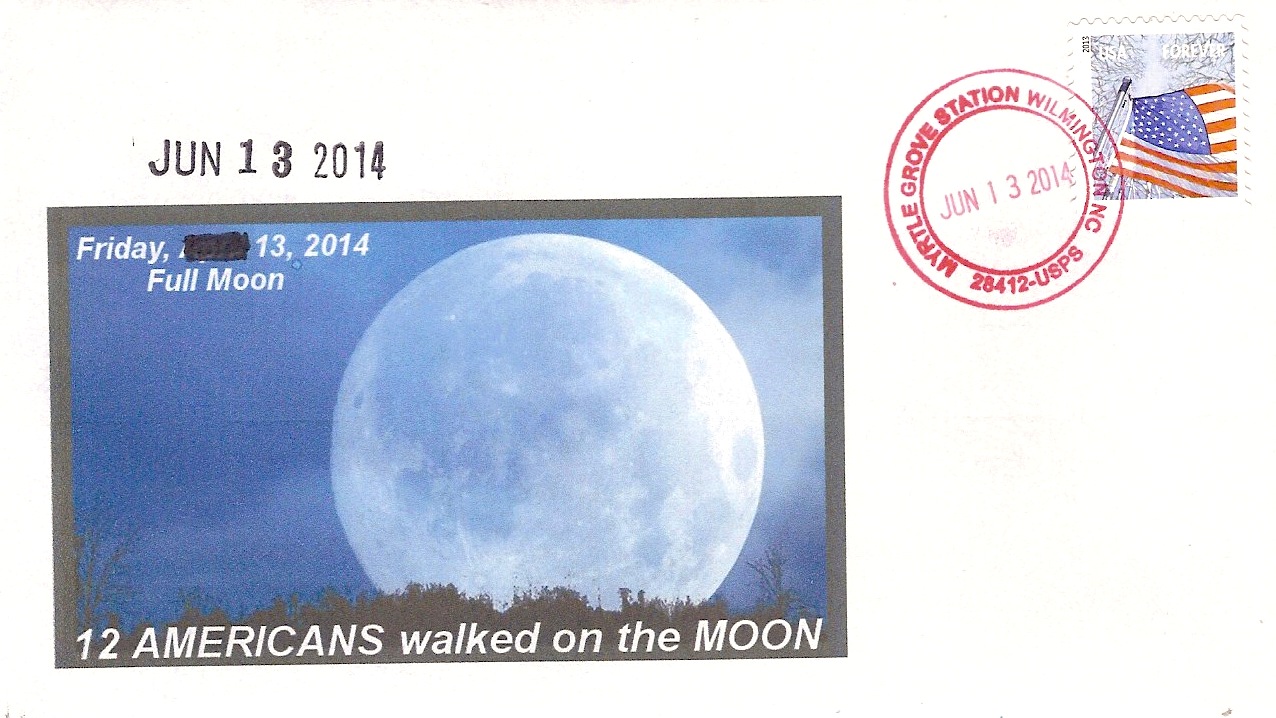 Forever | A set of covers canceled on Friday, June 13, 2014 at Wilmington NC recognizing the simultaneous superstitious impact of Friday, the 13th and a Full Moon. History: In numerology, the number 12 is considered the number of divine organizational arrangement or chronological completeness. Our year has 12 months, our clock face is divided into 12 hours, there were 12 deities of Olympus, there were 12 tribes of Israel, there were 12 Apostles of Jesus, there are 12 signs of the Zodiac, the quantity of 12 has been given the special name - dozen, etc. Noteworthy, there were 12 Americans (humans) who walked on our Moon. The number 13 has been considered irregular, transgressing the chronological completeness of the number 12. It is considered unlucky by Western superstition. There were 13 people at the Last Supper on Thursday and on the next day, Friday Jesus was crucified. For the superstitious, the simultaneous occurrence of Friday, the 13th with the Moon Phase of Full Moon deserves added attention. This only occurs when 3 independent variables line-up - the moon phase, the weekday and the day of the month. This previously occurred on October 13, 2000 and after June 13, 2014, will happen again on August 13, 2049. Many enjoy such events with a "Wilmington Water Tour" cruise on the Cape Fear River. The Moon and its movement of the tides energizes the imagination. Look at the Moon and reflect that 12 Americans (humans) walked on its surface. |