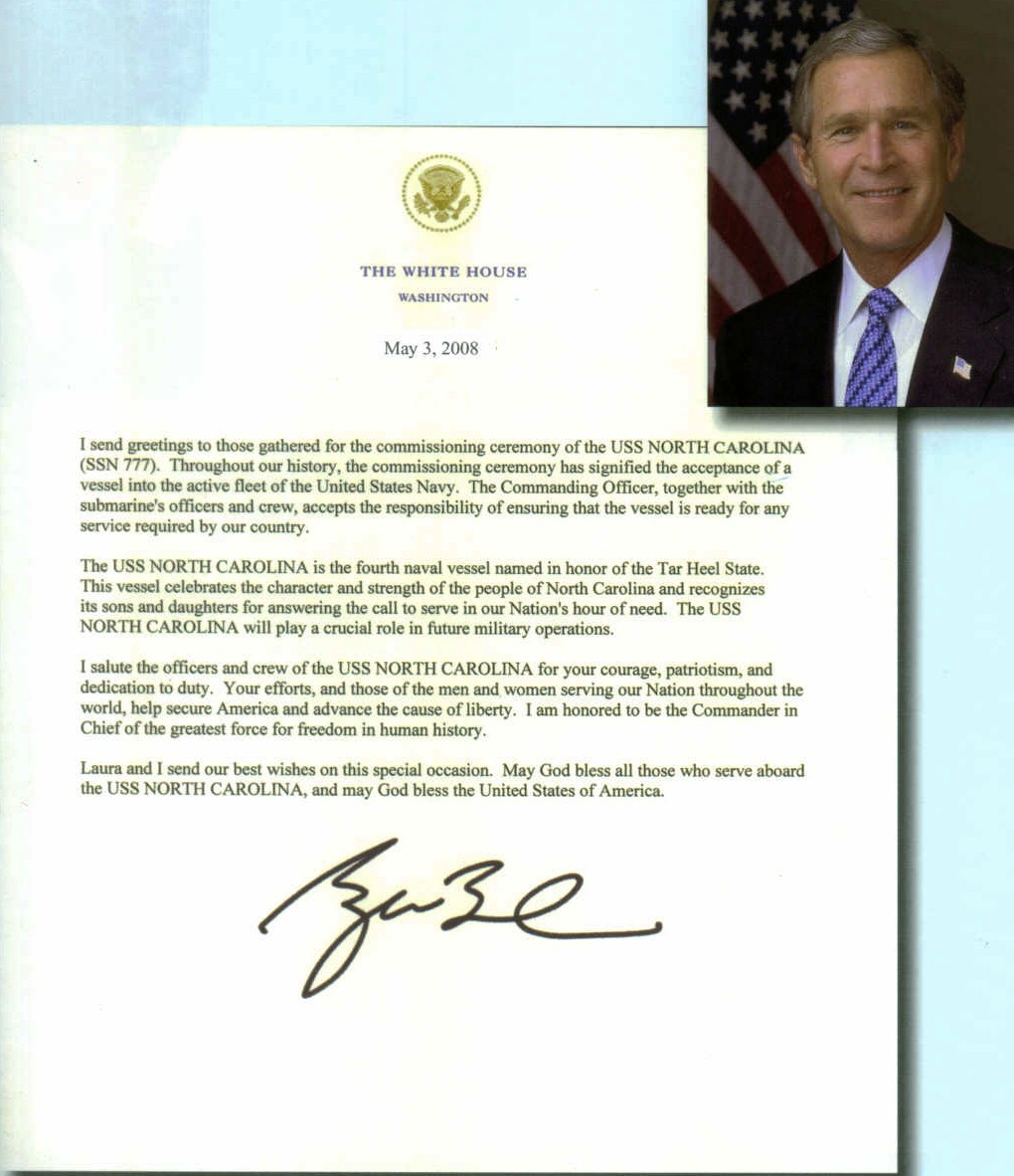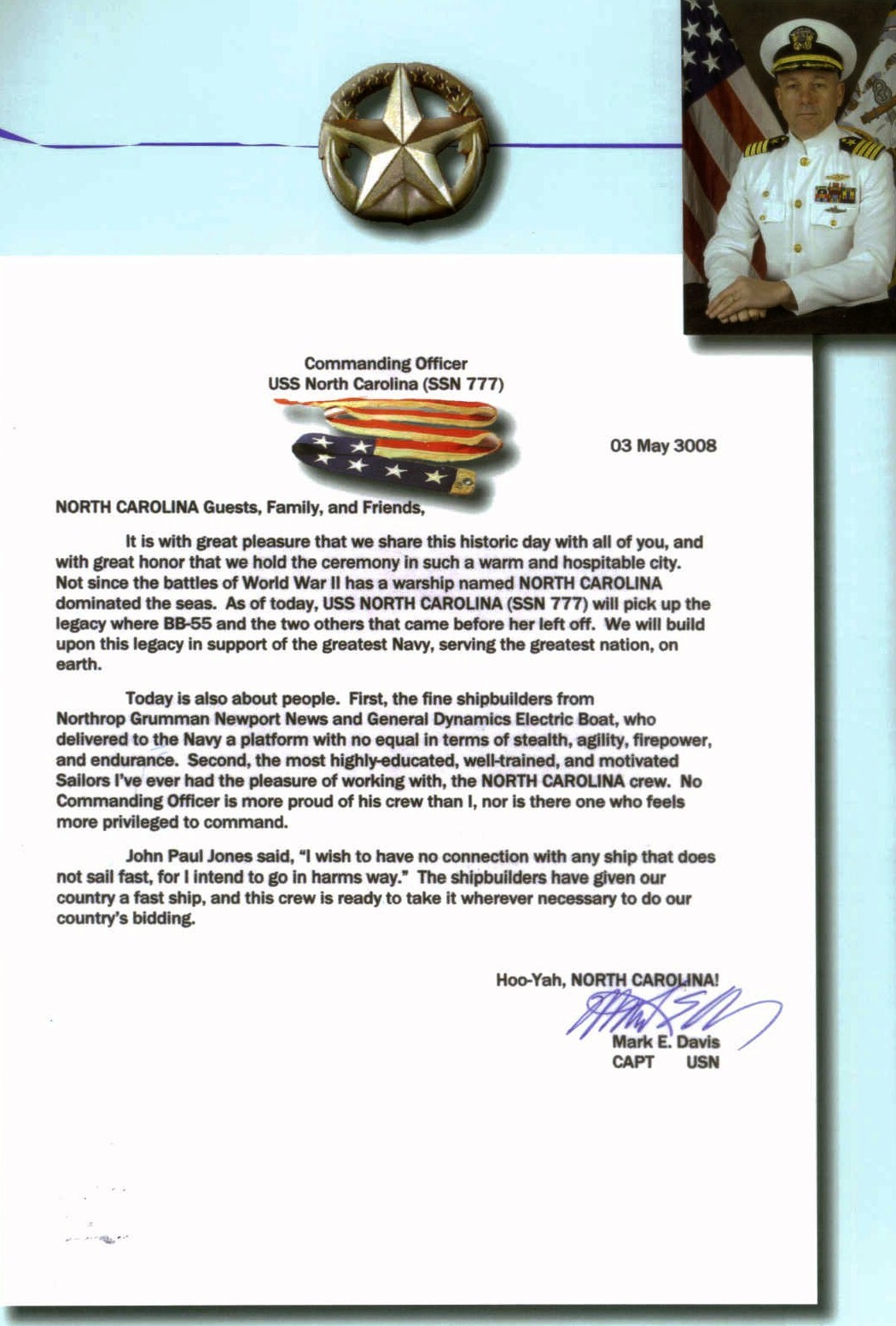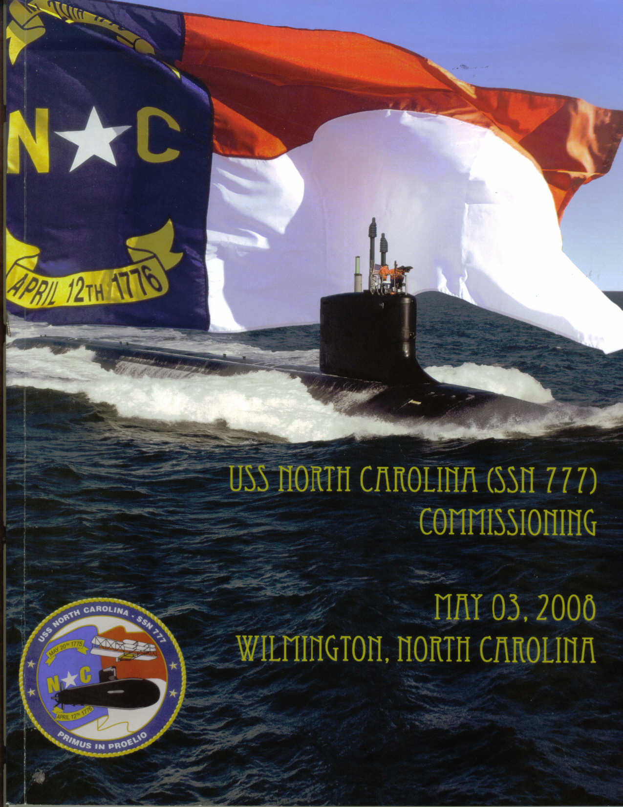 History: The commissioning ceremony marks a ship's entry into active service in the US Navy. At the moment the commissioning pennant breaks the masthead, the USS North Carolina became a Navy command in her own right taking its place alongside the active ships in the US Naval fleet. Many dignitaries attended the commissioning ceremony in Wilmington NC. Amongst many congradulatory letters, President George Bush sent his congradulations. Additionally, Captain Mark Davis, Commanding Officer of the USS North Carolina (SSN-777) expressed his thanks to the shipbuilders, Northrop Grumman Newport News and General Dynamics Electric Boat, to his crew of talented sailors and to the people of the US, of North Carolina, of Wilmington, the warm and hospitable city chosen for this commissioning ceremony. A commissioning program marked this special occassion. |