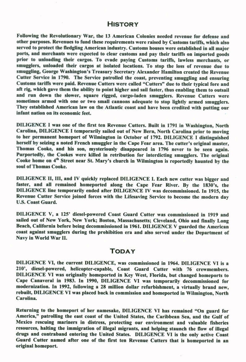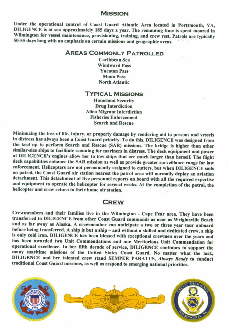 History: The United States Congress (Act of Congress) has recognized selected cities in the US as a "Coast Guard City." This designation is granted for five year periods subject to Congressional renewal. For a city to be recognized as a "Coast Guard City" it must have made special efforts to acknowledge the professional work of the Coast Guard men and women assigned to their area by regularly reaching out to them and their families and making them feel "at-home at their home-away-from-home." Such city efforts should be indicative of a longstanding and enduring relationship, a partnership between the city and members of the Coast Guard family and their dependents. It is important to note that there has been a Coast Guard Cutter stationed in Wilmington almost continually since 1792. The current Cutter in Wilmington is called "Diligence." It is the sixth Coast Guard cutter to have the name "Diligence" and has been assigned to Wilmington since 1992. There have been six cutters named "Diligence" and five of these have been home-ported in Wilmington. Diligence #1 through #4 were based in Wilmington from 1792 to 1830's while Diligence #5 saw duty from 1919 to 1961 in New York NY, Boston MA, Cleveland OH and Long Beach CA. Since Diligence #1 (one of the first original ten Coast Guard "Revenue Cutters") was based in Wilmington NC, it is fitting that the current Diligence #6 is also based here. The US Coast Guard bestowed the title of "Coast Guard City" to Wilmington NC during a recertification ceremony on July 26, 2008. Wilmington Mayor Bill Saffo said, "Wilmington truly values its relationship with the Coast Guard and will continue to strive to live up to the honor of being a Coast Guard City." Representative Mike McIntyre (NC's 7th Congressional District) said, "Because of their readiness, the Coast Guard has given us a history to be proud of, a heritage to treasure and a hope for tomorrow." As part of the recertification ceremony Coast Guard Seaman Houston Edwards and Petty Officer 3rd Class Joseph Harris (Coast Guard Station Oak Island NC) accepted a wreath from Representative Mike McIntire and Mayor Bill Saffo. The wreath was dedicated to honor US servicemen and women, both past and present and was placed in the Cape Fear River. Grand Haven MI November 13, 1998 Eureka CA June 3, 2000 Mobile AL July 4, 2002 Morgan City LA September 1, 2002 Wilmington NC July 25, 2003 Newport OR March 28, 2005 Alameda CA April 14, 2006 Kodiak AK September 15, 2007 Rockland ME under consideration Clearwater FL under consideration ~~~~~~~~~~~~~~~~~~~~~~~~~~~~~~~~~~~ Welcome aboard the US Coast Guard Cutter, Diligence #6 Page 1 Page 2 Page 3 Page 4 ~~~~~~~~~~~~~~~~~~~~~~~~~~~~~~~~~~~ Missions of the US Coast Guard Search & Rescue National Homeland Security Commerce Maritime Law Enforcement Environmental Protection |