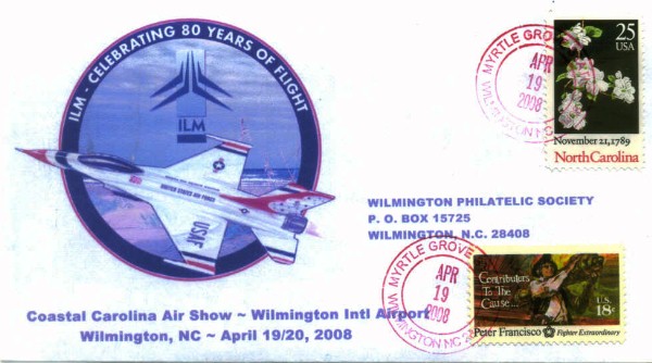 A cover sent from Wilmington NC on April 19, 2008. It commemorated the Coastal Carolina Air Show held at Wilmington International Airport. Amongst the many aerial performers at the Air Show, the main attraction was the US Air Force Thunderbirds. History: In the early 1950's the US Air Force saw the need to create a precision aerial maneuver flight team who could demonstrate to the public the capabilities of its high-performance aircraft. On January 1, 1953 the Thunderbirds were activated as the 3600th Air Demonstration Team at Luke Air Force Base near Phoenix AZ. Initially they flew the F-84 Thunderjet performing before audiences across the US and later in many foreign countries. This history of the Thunderbirds includes a succession of high performance aircraft flown by top notch pilots from all walks of life augmented by a support team performing in over 30 career fields. 1953-1954 Republic F-84G Thunderjet 1954-1956 Republic F-84F Thunderstreak 1956-1963 North American F-100C Super Sabre 1964 Republic F-105B Thunderchief 1964-1968 North American F-100D Super Sabre 1969-1973 McDonnell F-4E Phantom II 1974-1981 Northrop T-38 Talon 1982 "Diamond Crash" in January - sat out the airshow season 1983-1991 General Dynamics F-16A/B Fighting Falcon 1992-Present Lockheed Martin F-16C/D Fighting FalconThe Thunderbirds not only instill pride and patriotism in America but inspire the dreams and ignite imagination of our youth. They stand tall as "America's Ambassadors in Blue." Visit the Wilmington Philatelic Society web-site. |