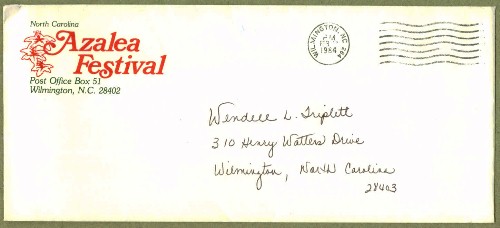 from the "North Carolina Azalea Festival" in Wilmington to Wendell Triplett in Wilmington. The cover is somewhat