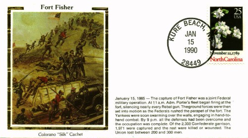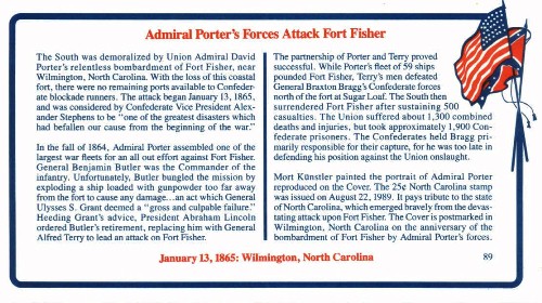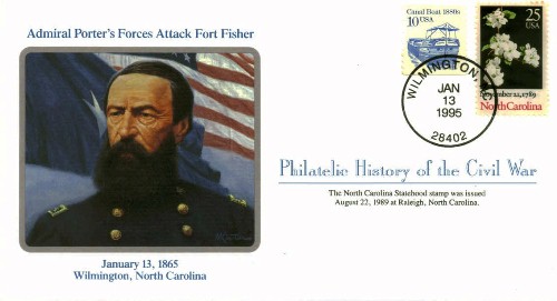 Wilmington. It commemorates the joint Army-Navy attack on Fort Fisher, the last battle of the Civit War. History: Wilmington remained open until the last months of the Civil War. Finally, in January 1865, the Northern Union navy staged a massive bombardment and assault of Fort Fisher. Fort Fisher fell on January 15, 1865, followed by Wilmington a few weeks later. Admiral Porter lead the Northern Union Navy's relentless bombardment. |