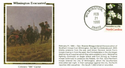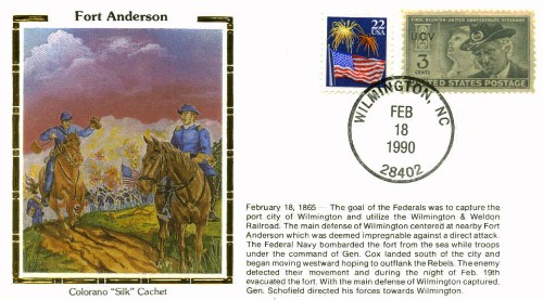 Wilmington. It commemorates the fall of Wilmington and the end of the Civit War (attack on Fort Anderson). History: Wilmington remained open until the last months of the Civil War. Finally, in January 1865, the Northern Union navy staged a massive bombardment and assault of Fort Fisher. Fort Fisher fell on January 15, 1865, followed by Wilmington a few weeks later on February 22, 1865. |